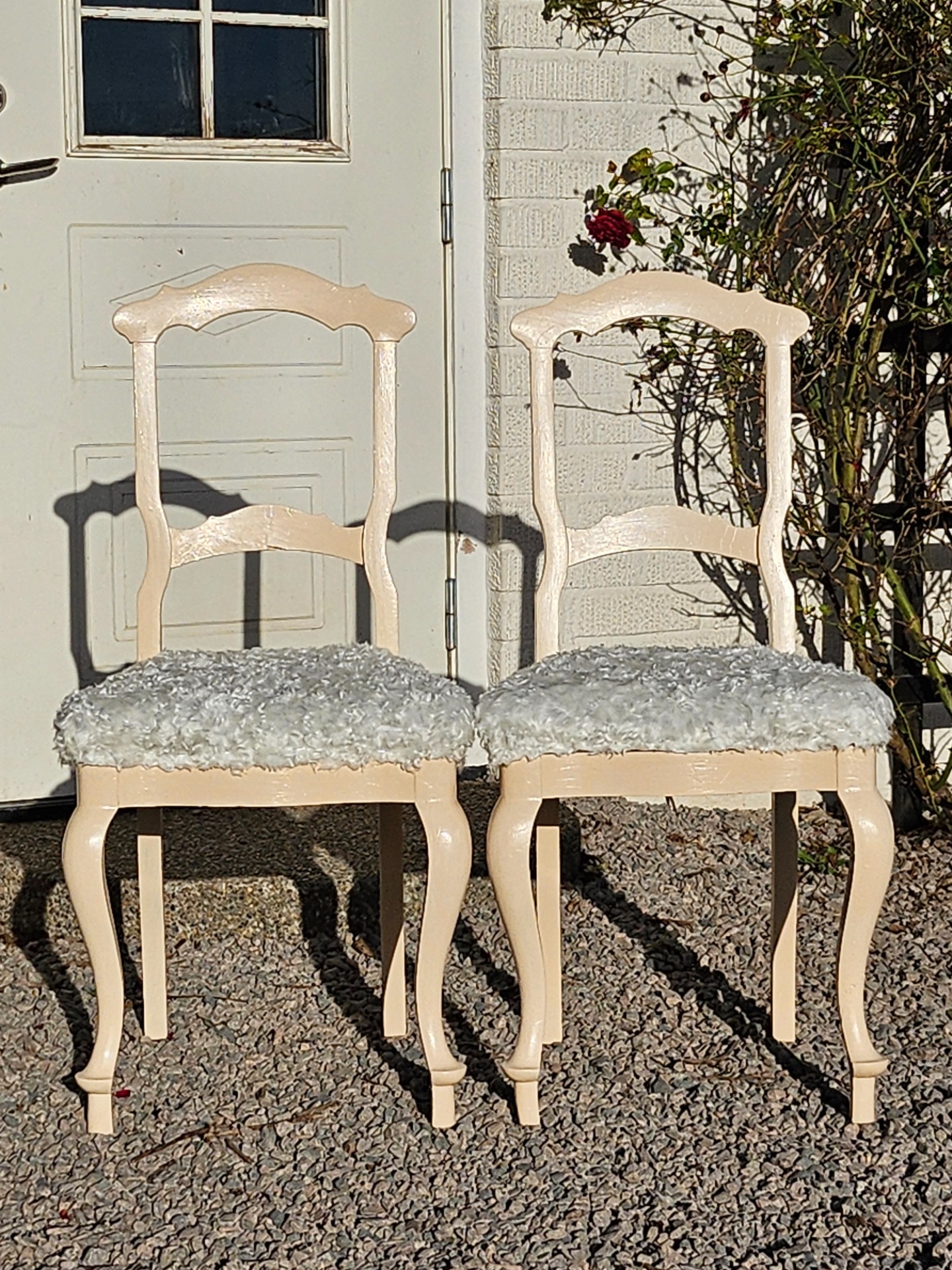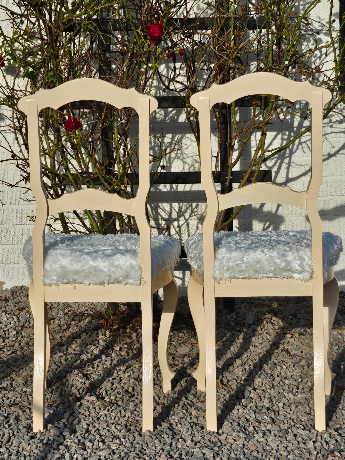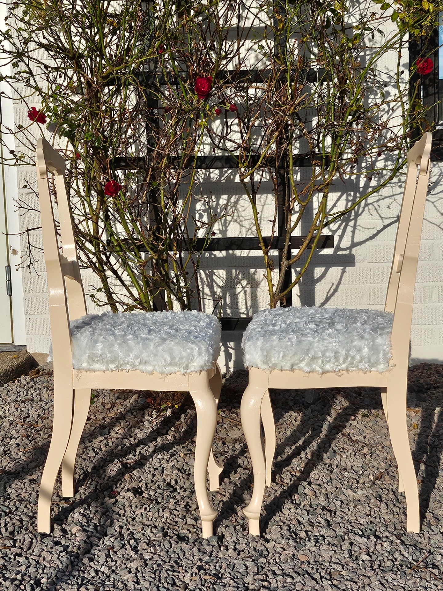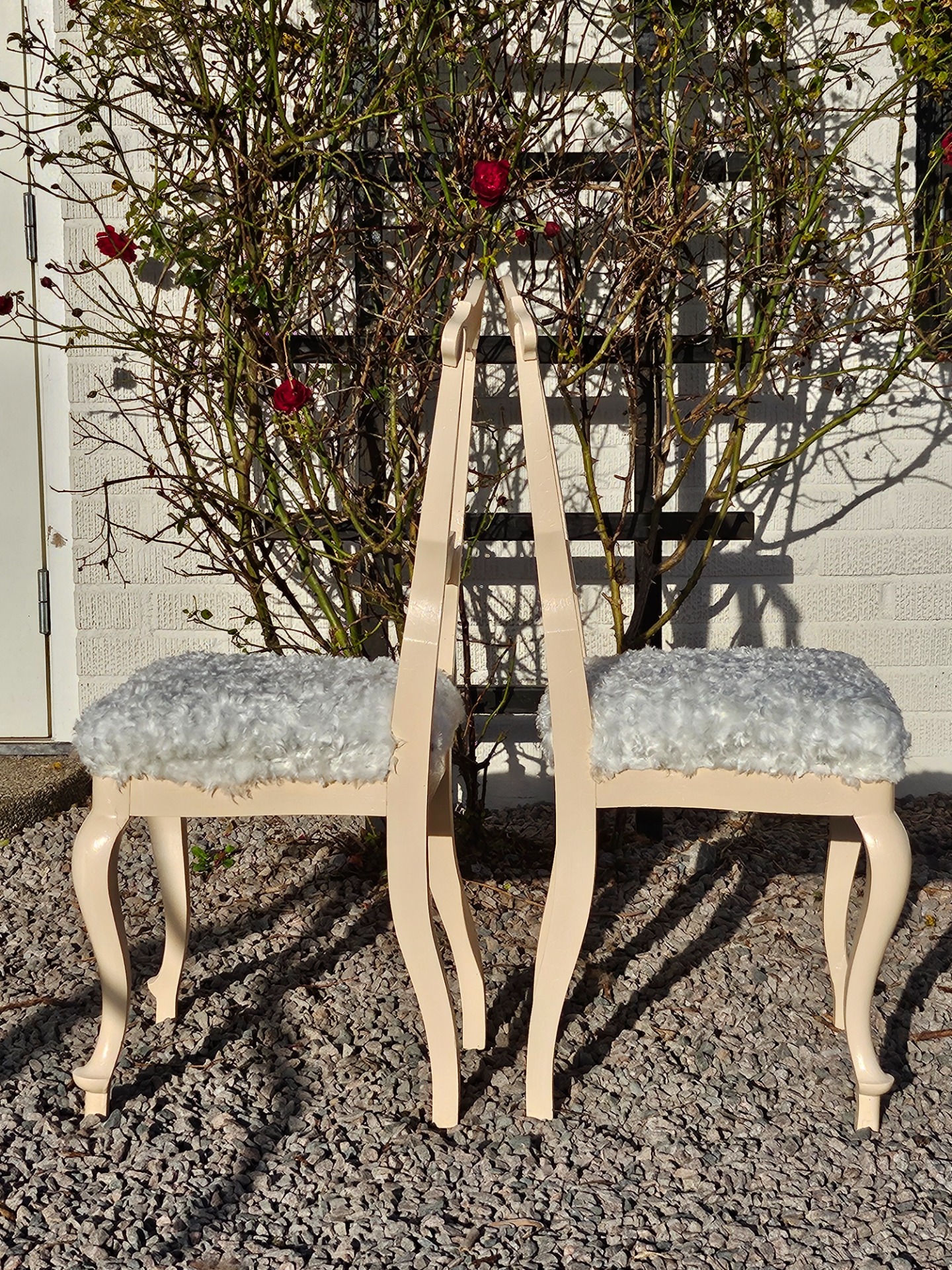 2 st allmogestolar handmålade med linoljefärg från Ottossons färgmakeri i kulören gulrosa. Stolarna är klädda med fårskinnstyg.