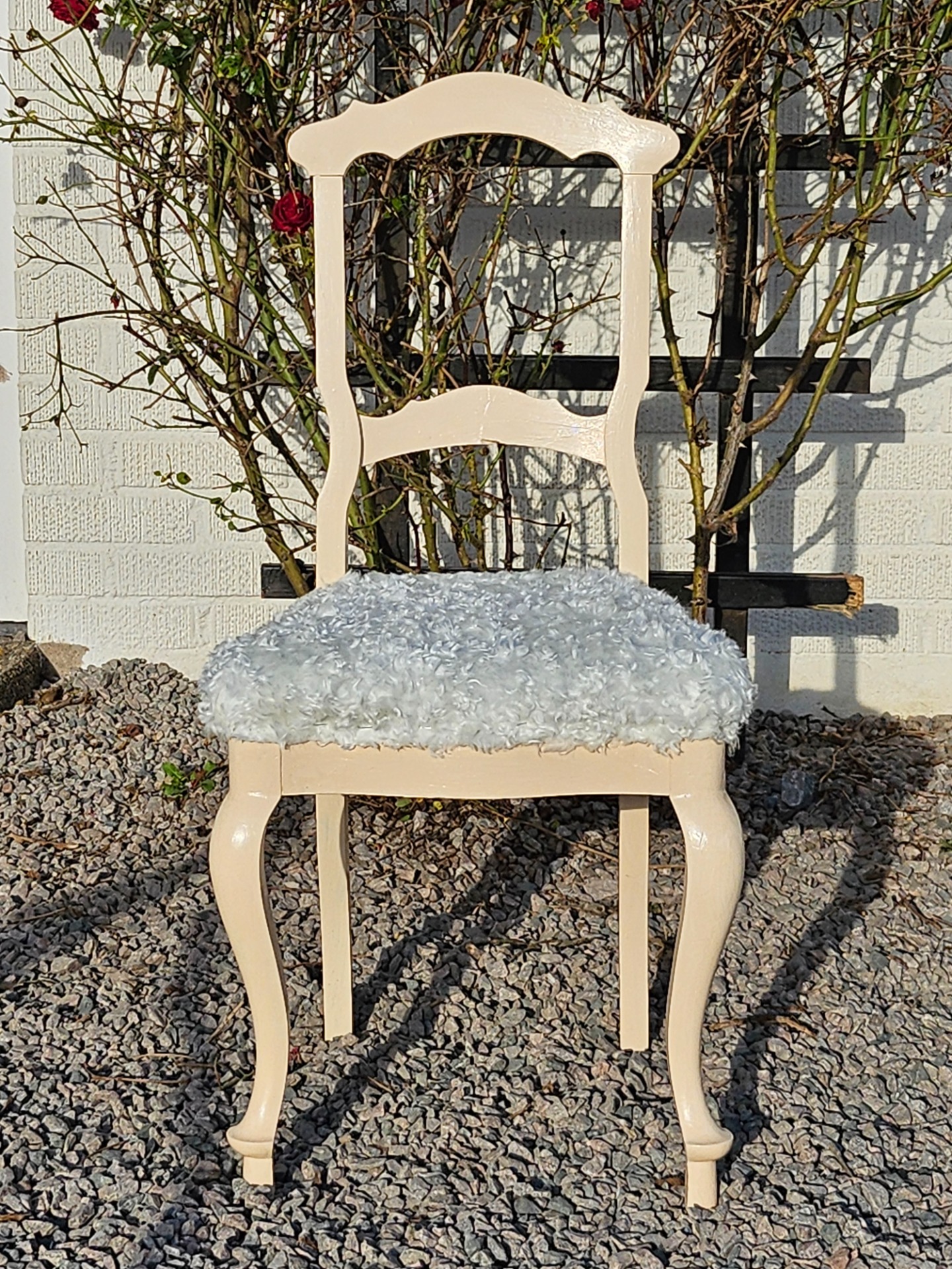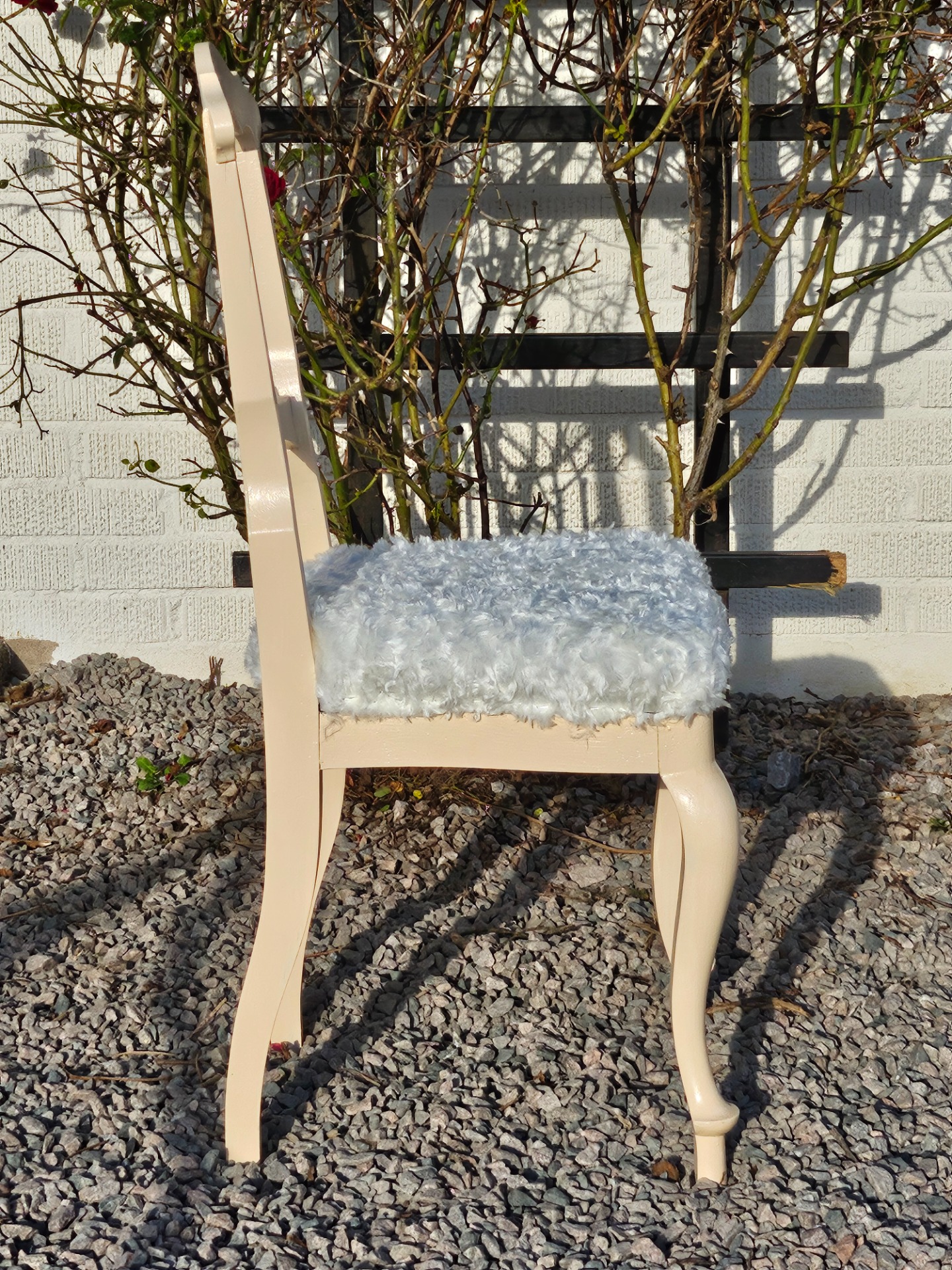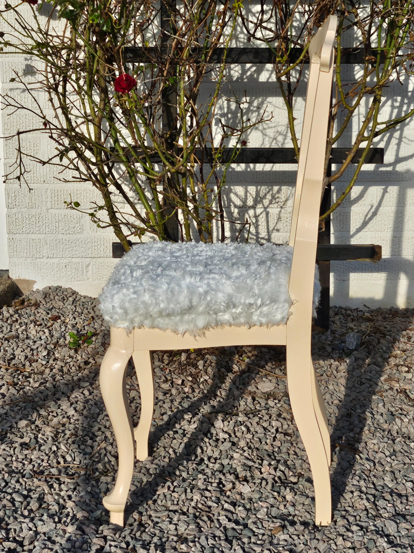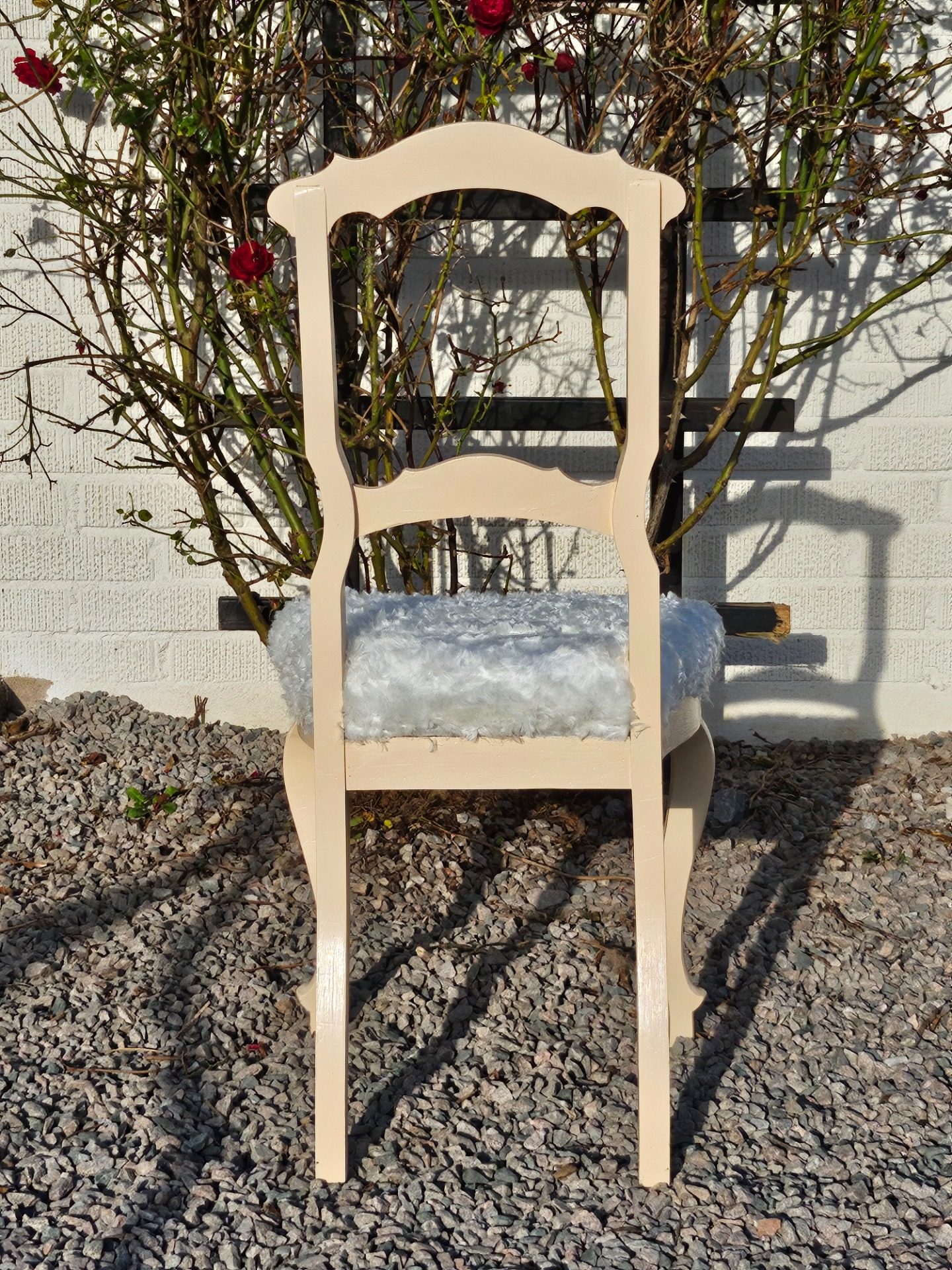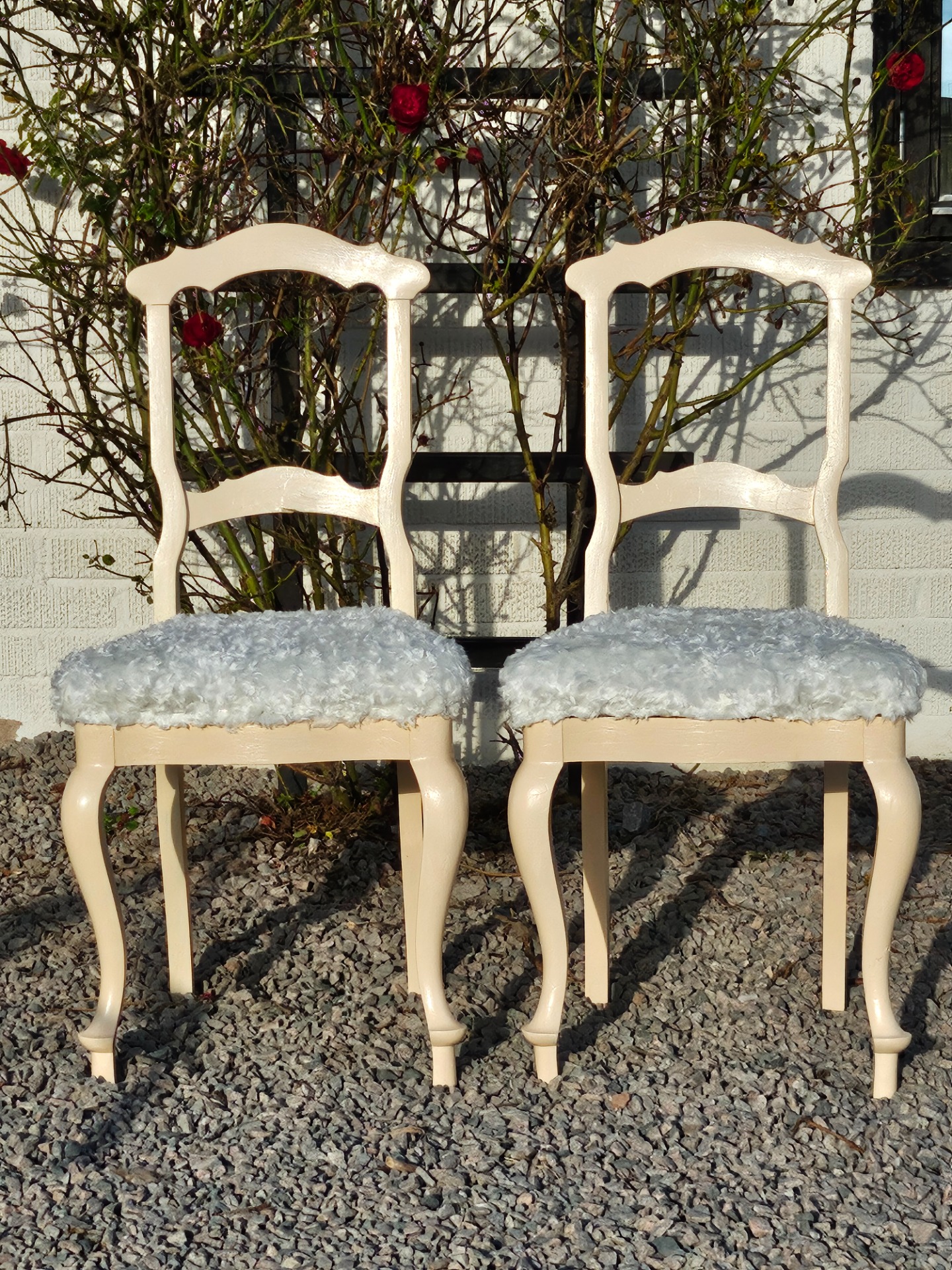 2 st allmogestolar handmålade med linoljefärg från Ottossons färgmakeri i kulören gulrosa. Stolarna är klädda med fårskinnstyg.