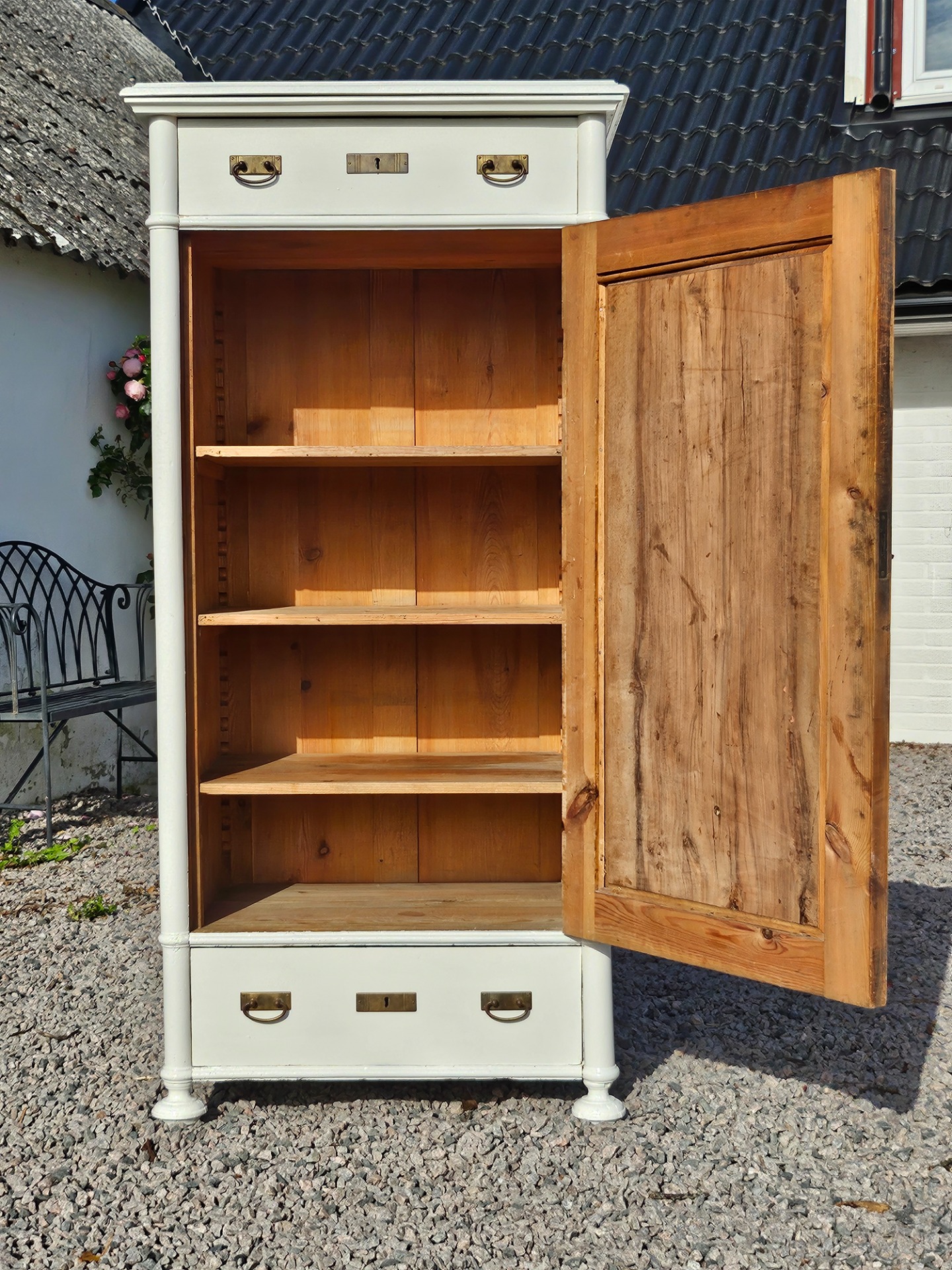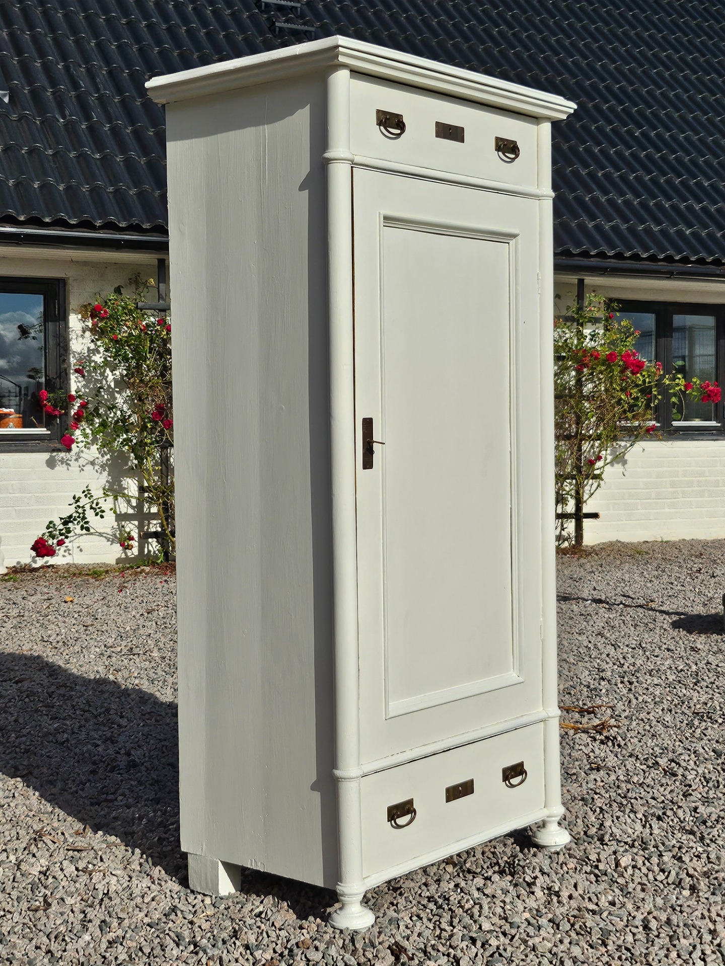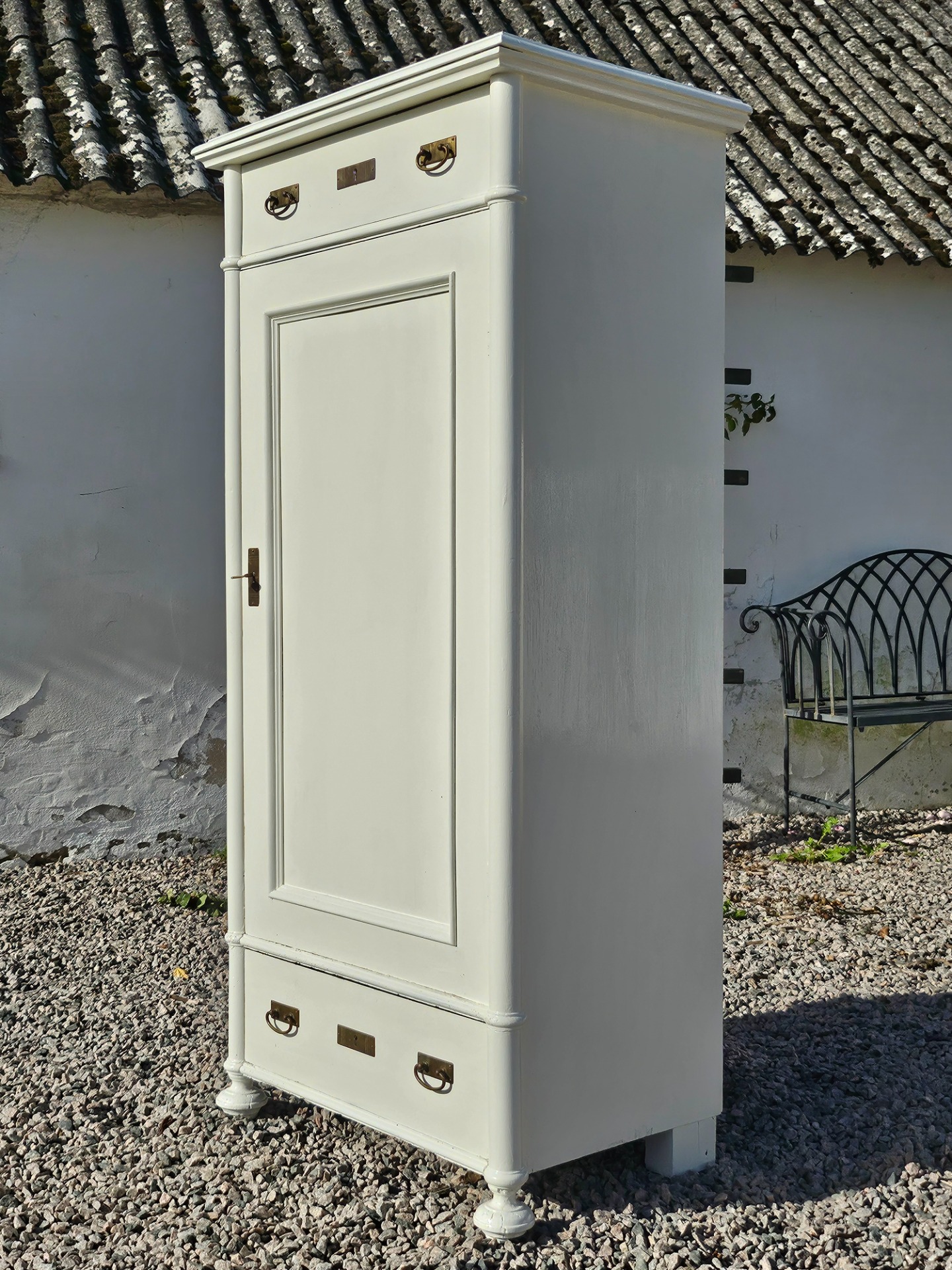 Bedårande drängaskåp 1880-t handmålad med linoljefärg från Ottossons färgmakeri i kulören kittvit. Orginal mässingbeslag och nyckel.
