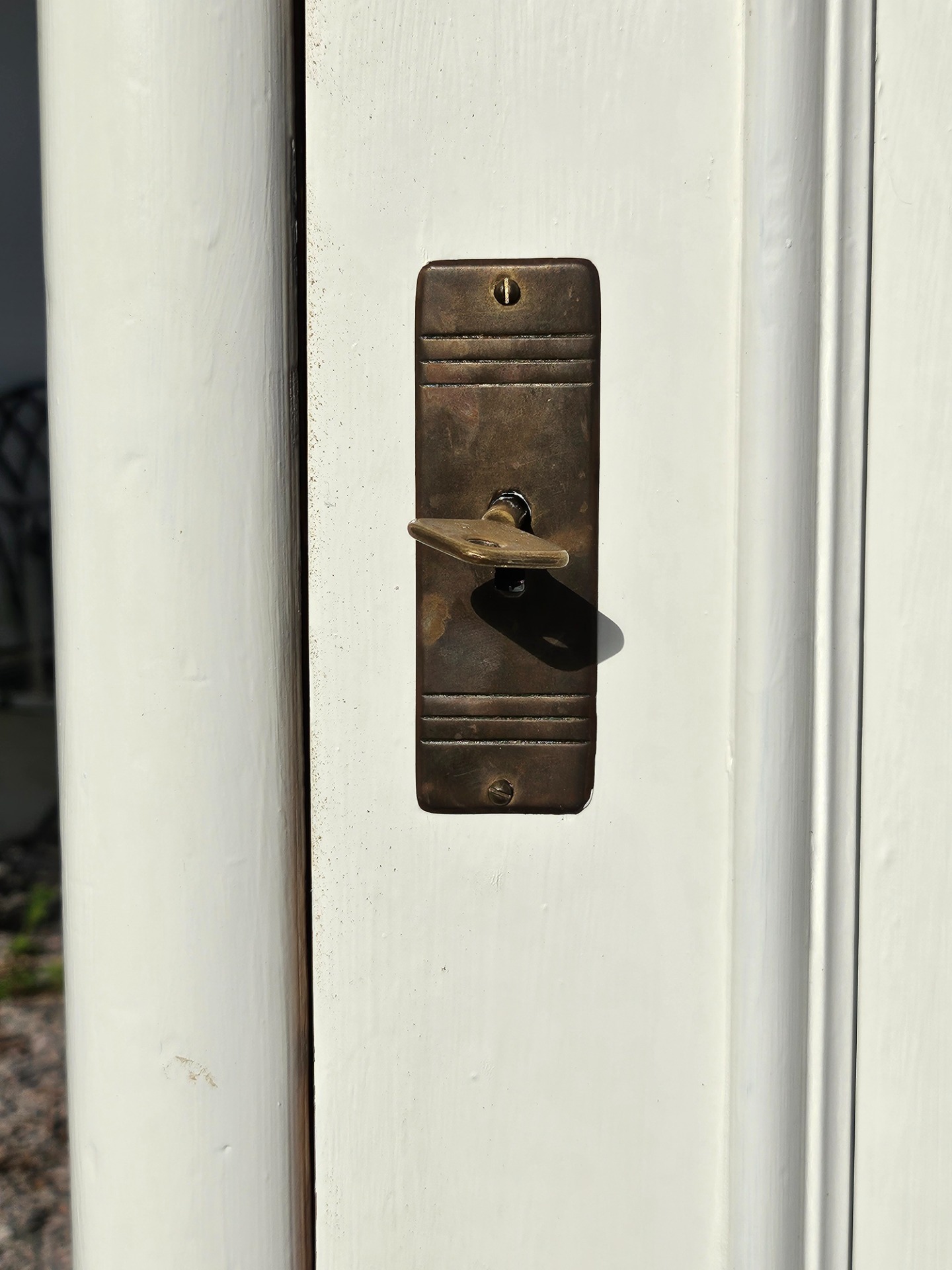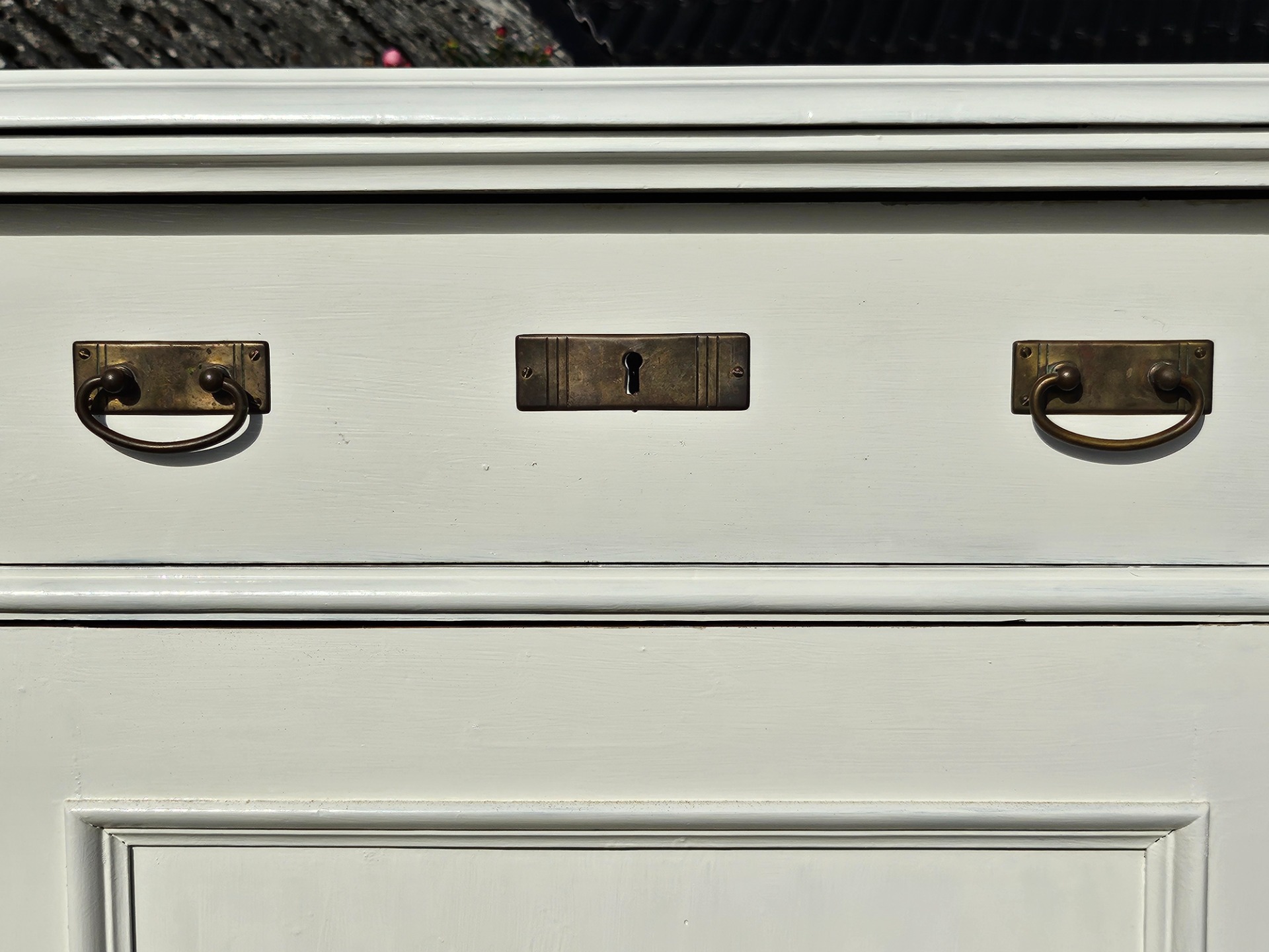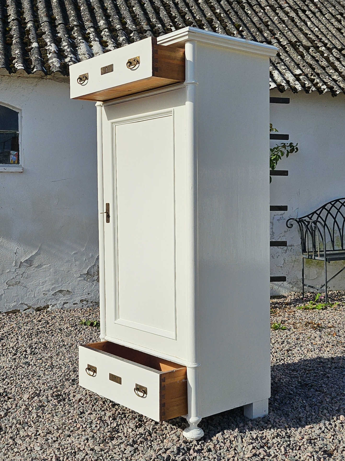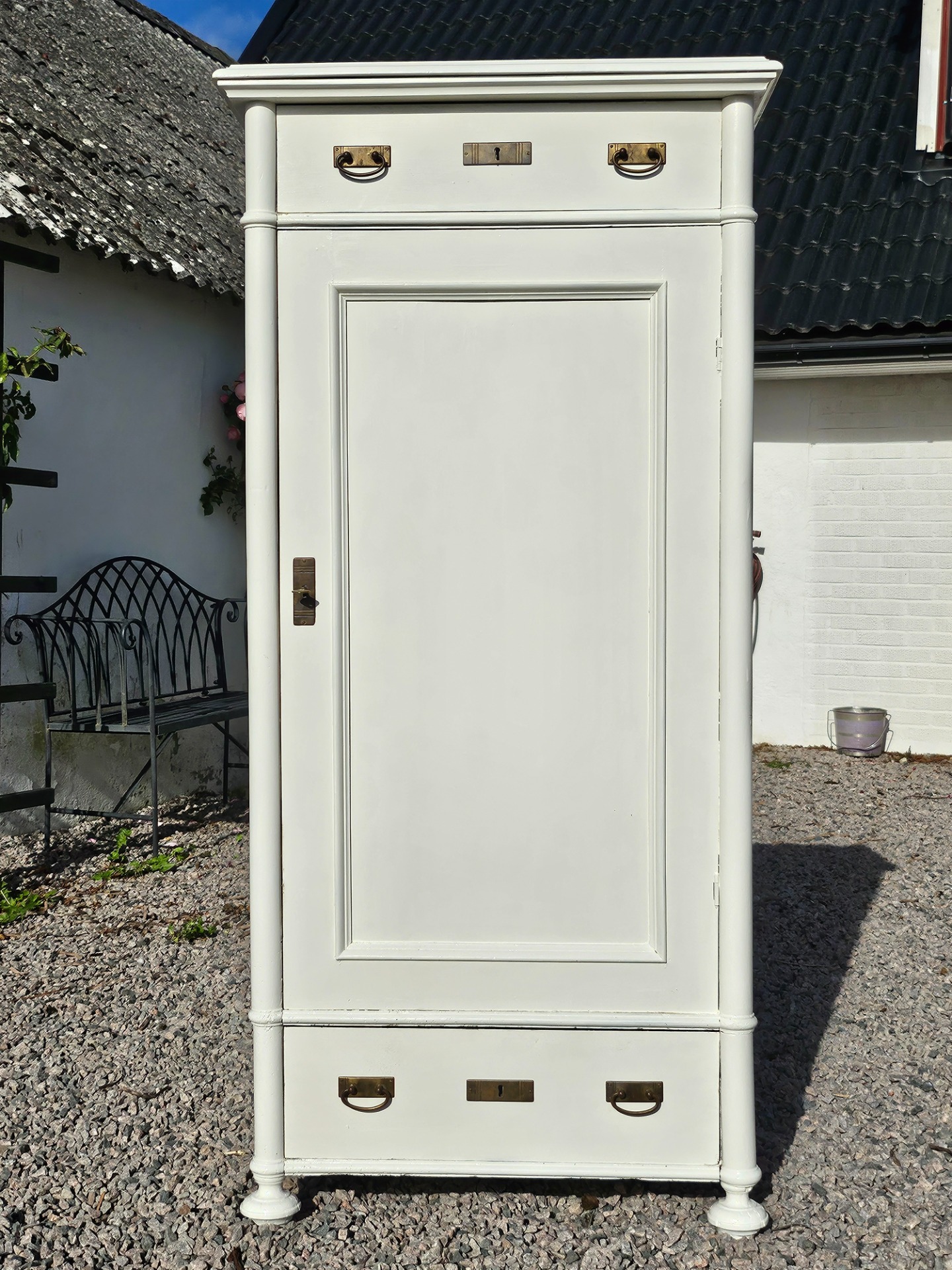 Bedårande drängaskåp 1880-t handmålad med linoljefärg från Ottossons färgmakeri i kulören kittvit. Orginal mässingbeslag och nyckel.