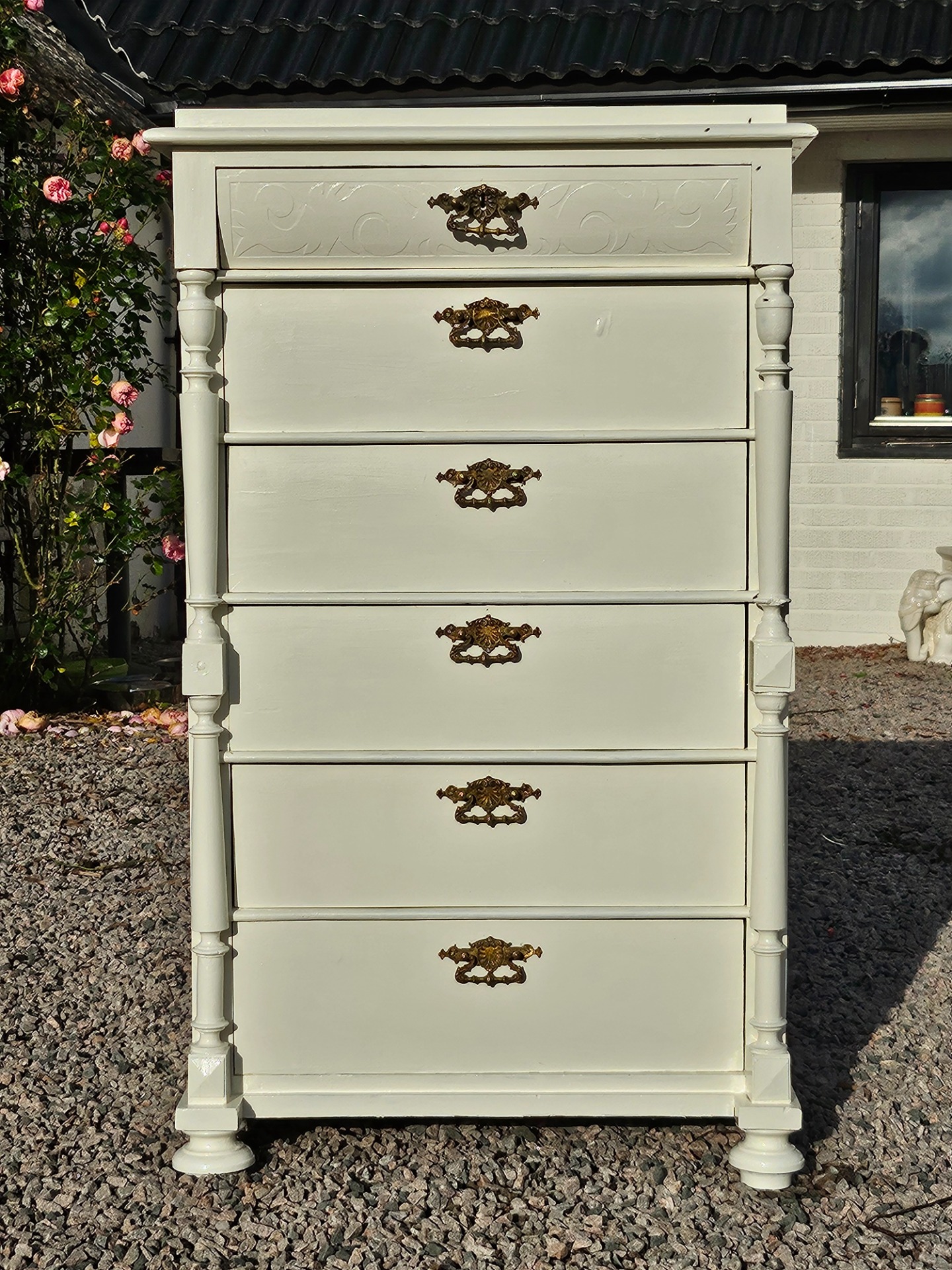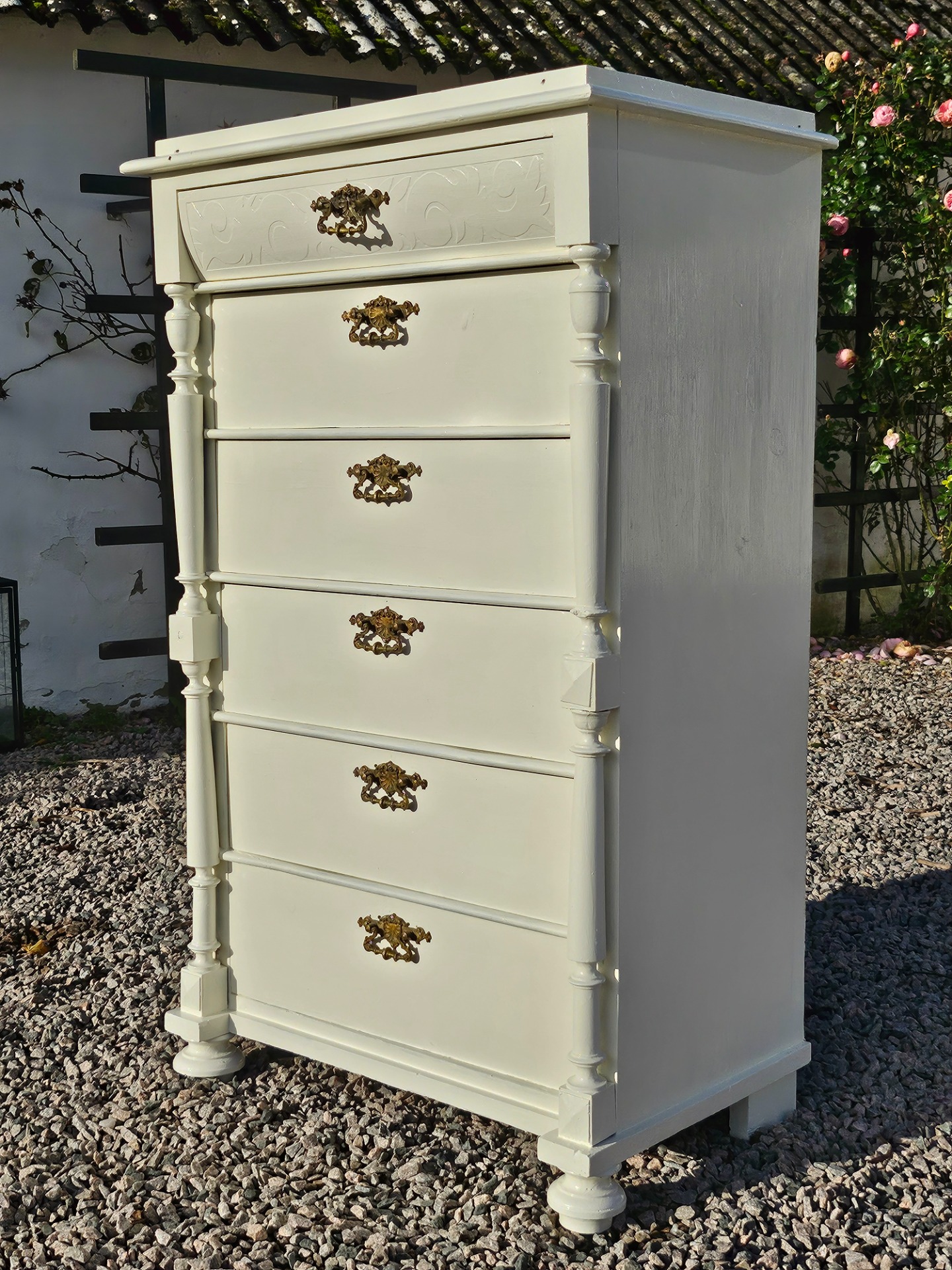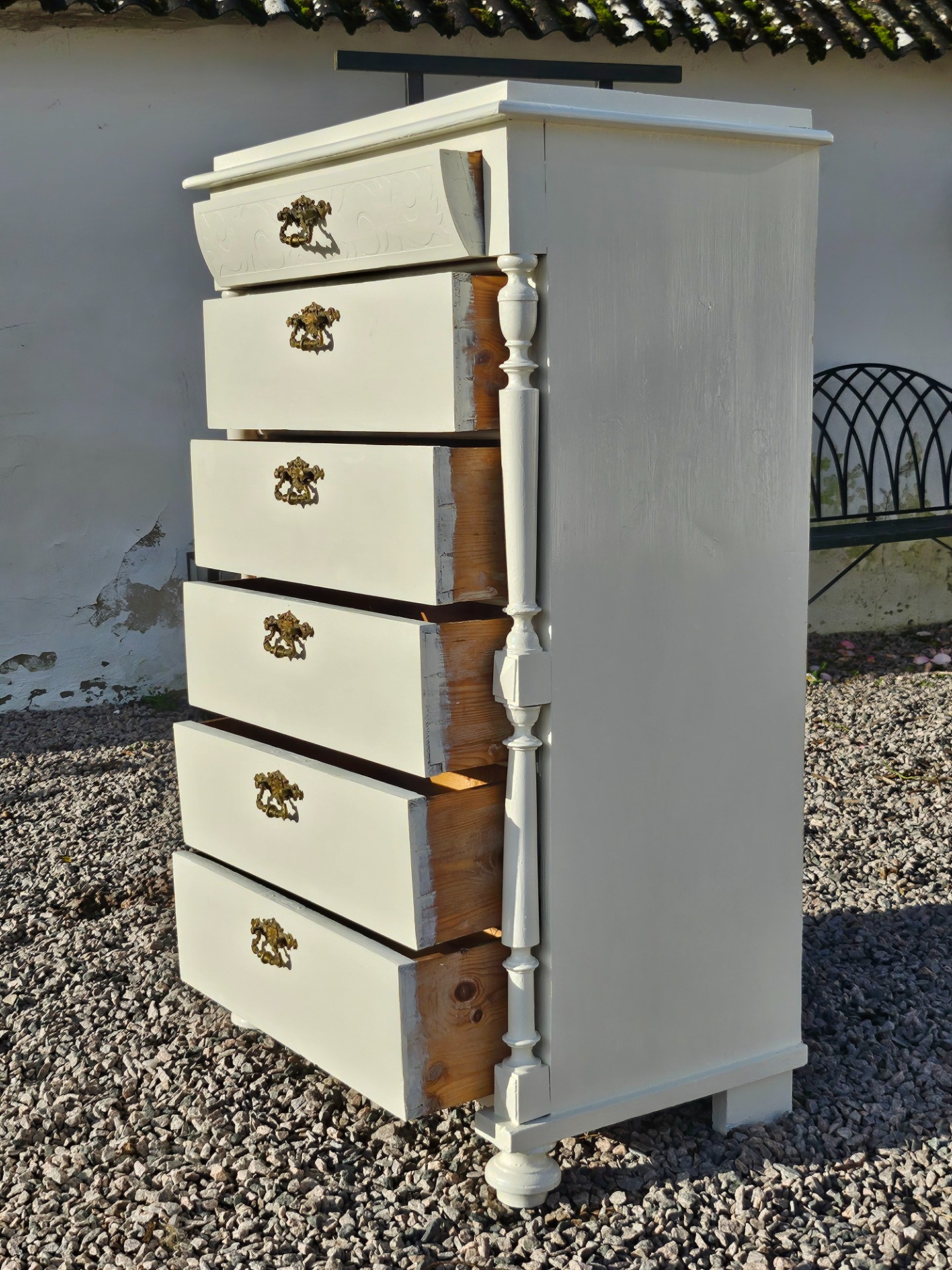 Sockersöt 6-lådig byrå 1880-t handmålad med linoljefärg från Ottossons färgmakeri i kulören kittvit. Vackra antika mässingbeslag.