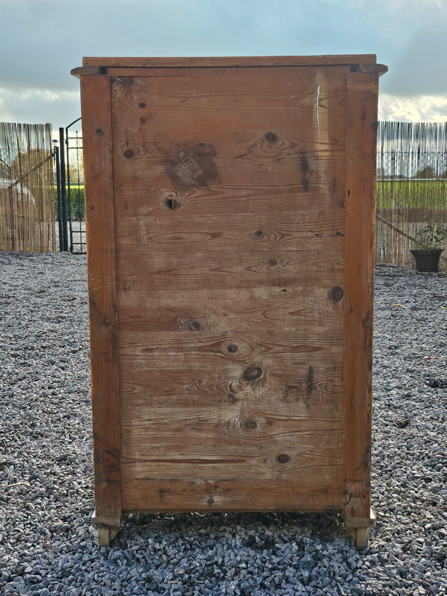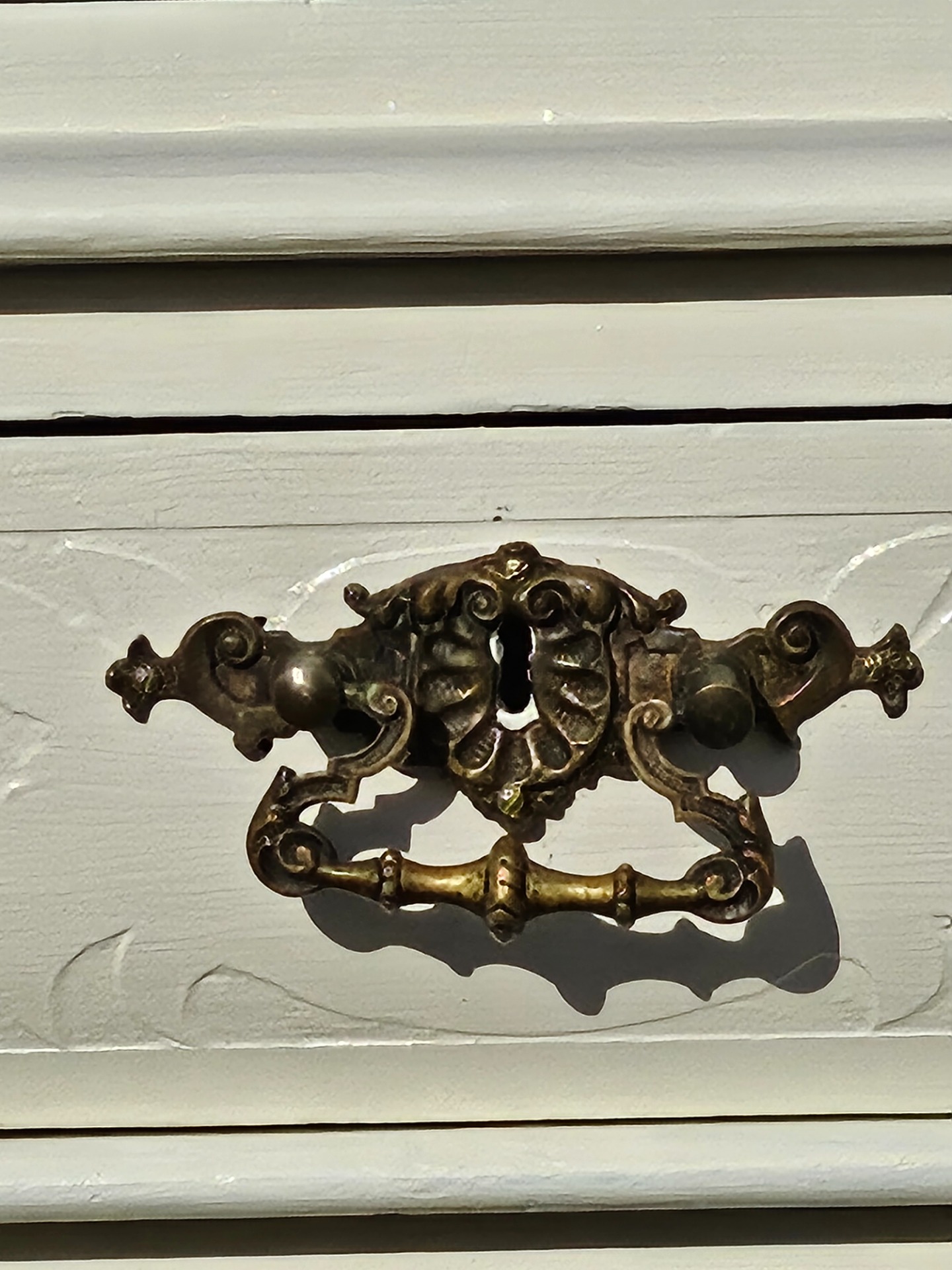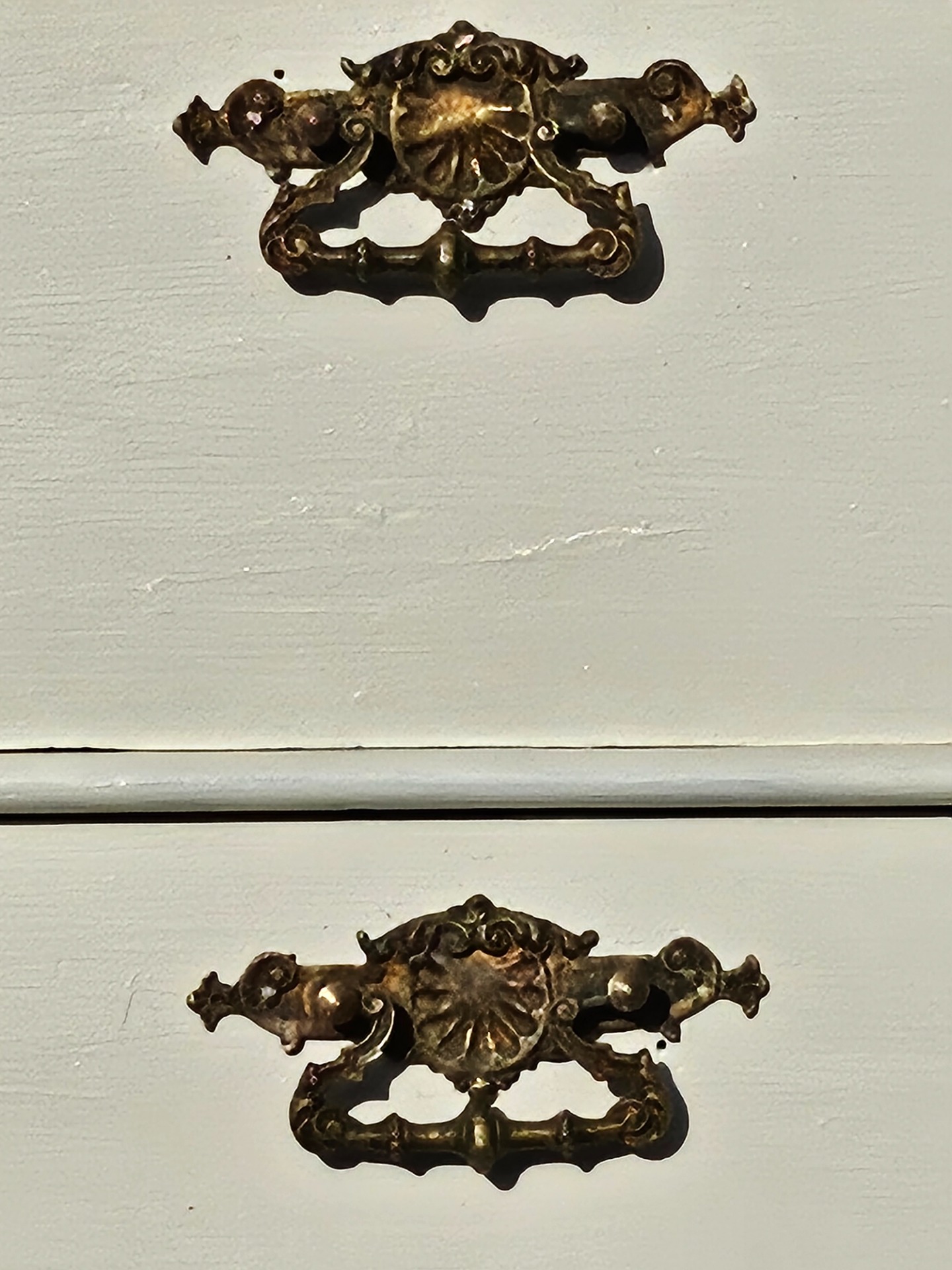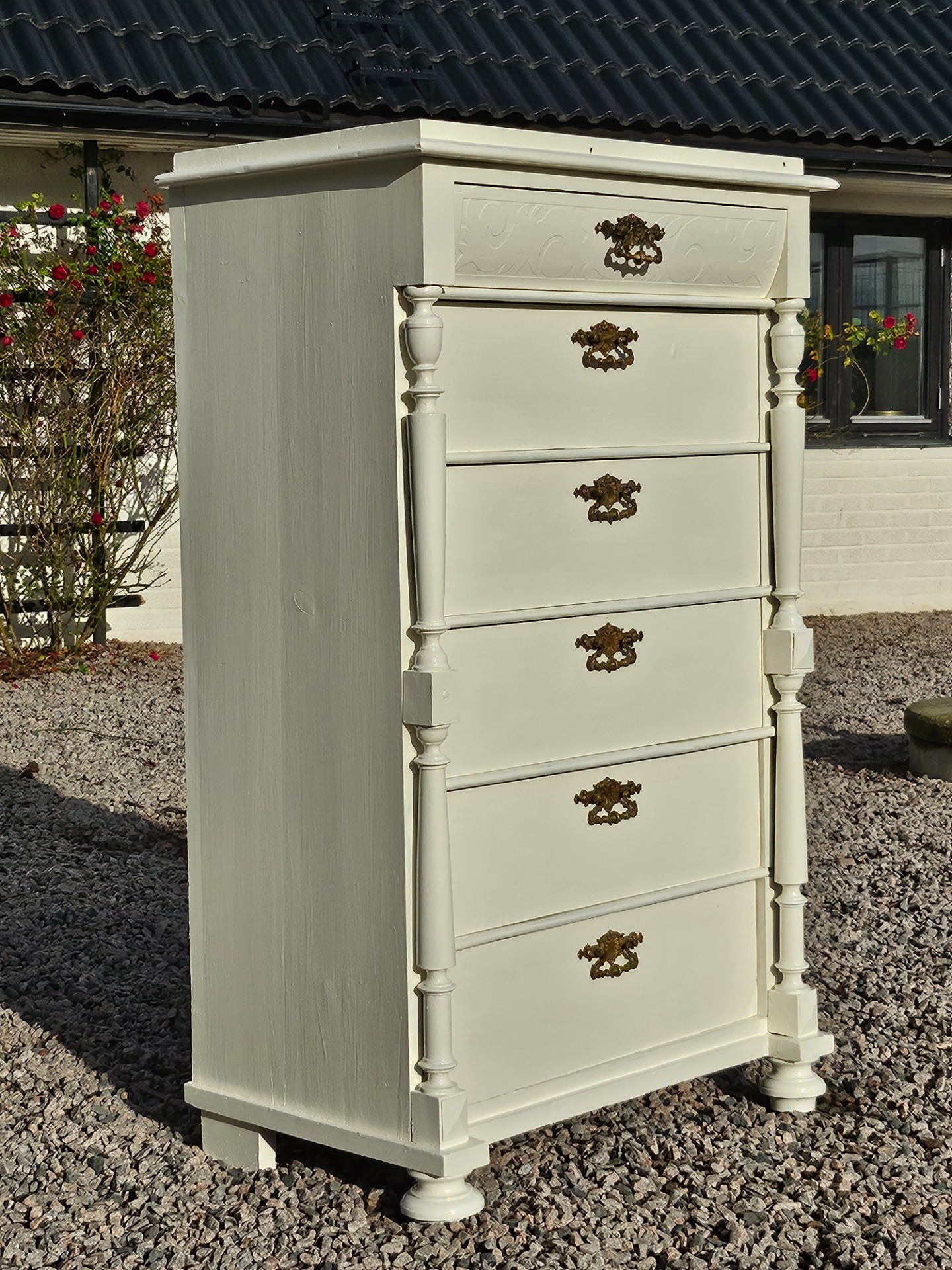 Sockersöt 6-lådig byrå 1880-t handmålad med linoljefärg från Ottossons färgmakeri i kulören kittvit. Vackra antika mässingbeslag.