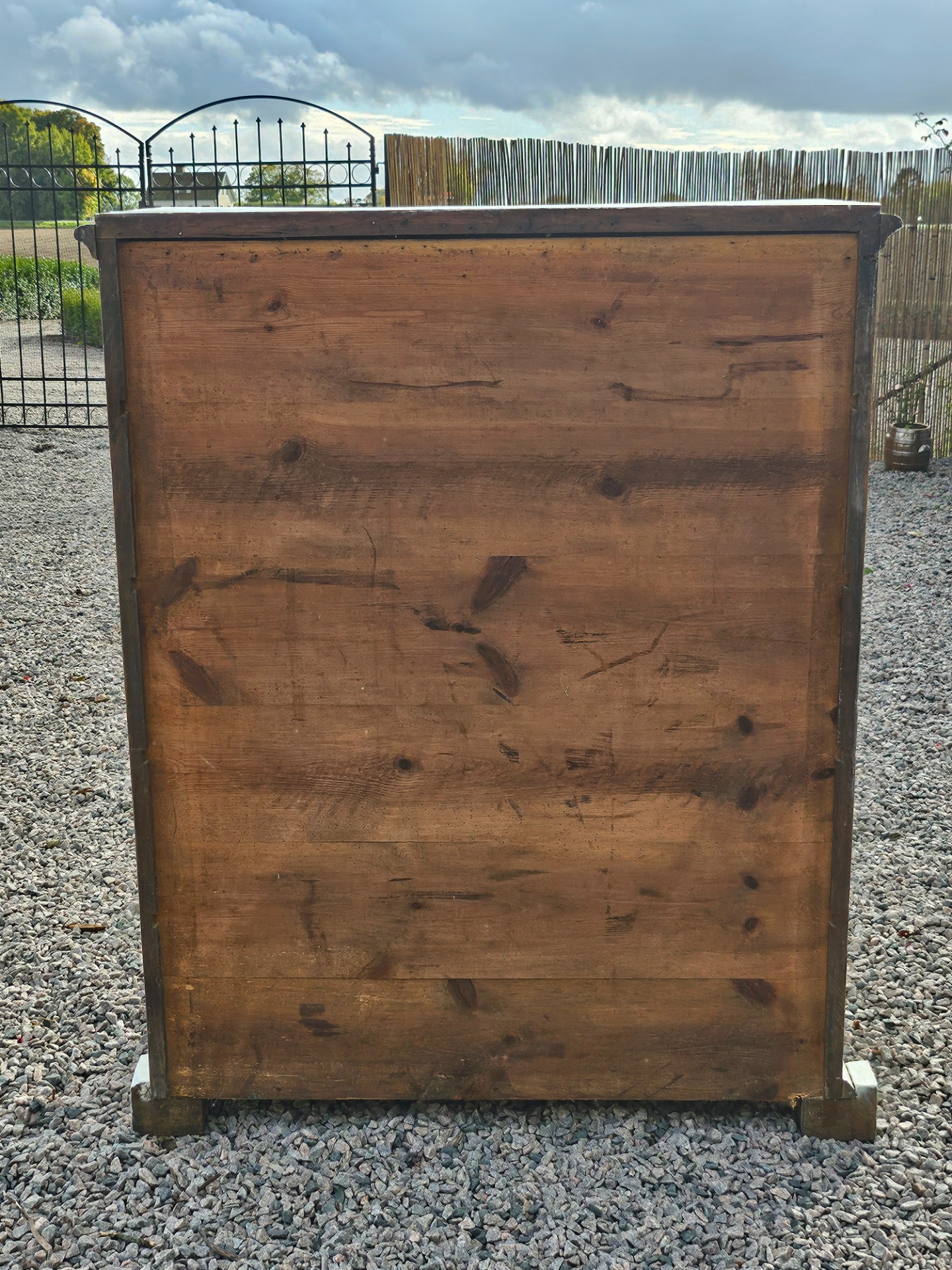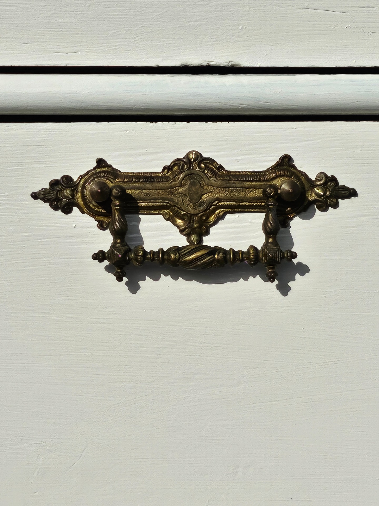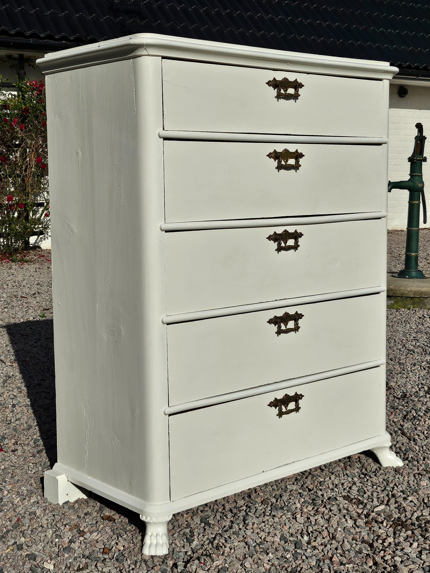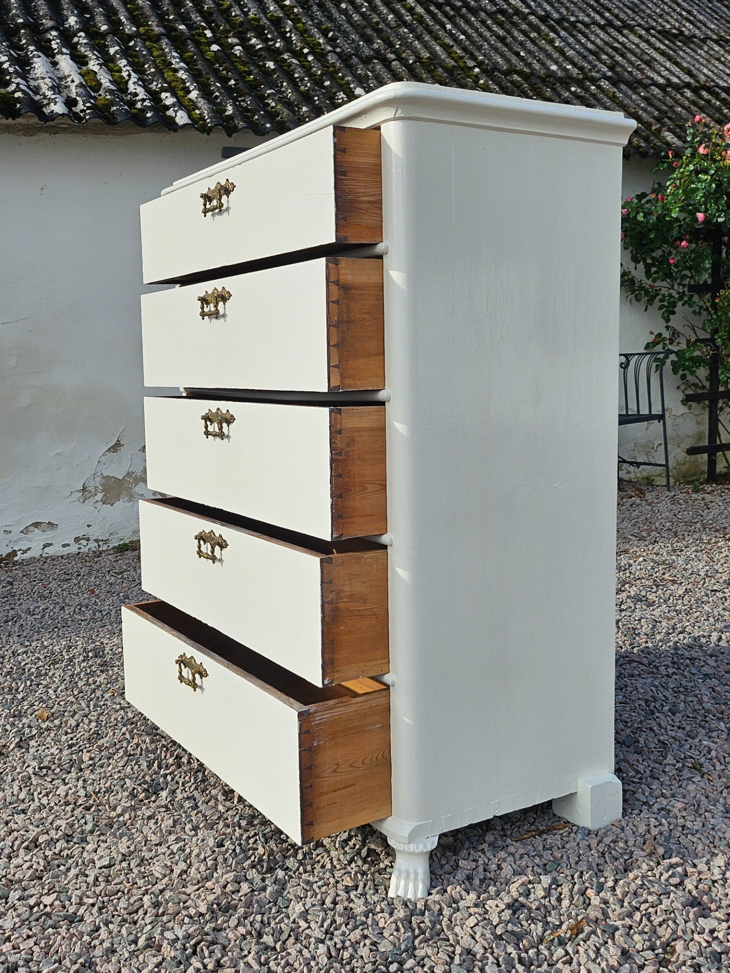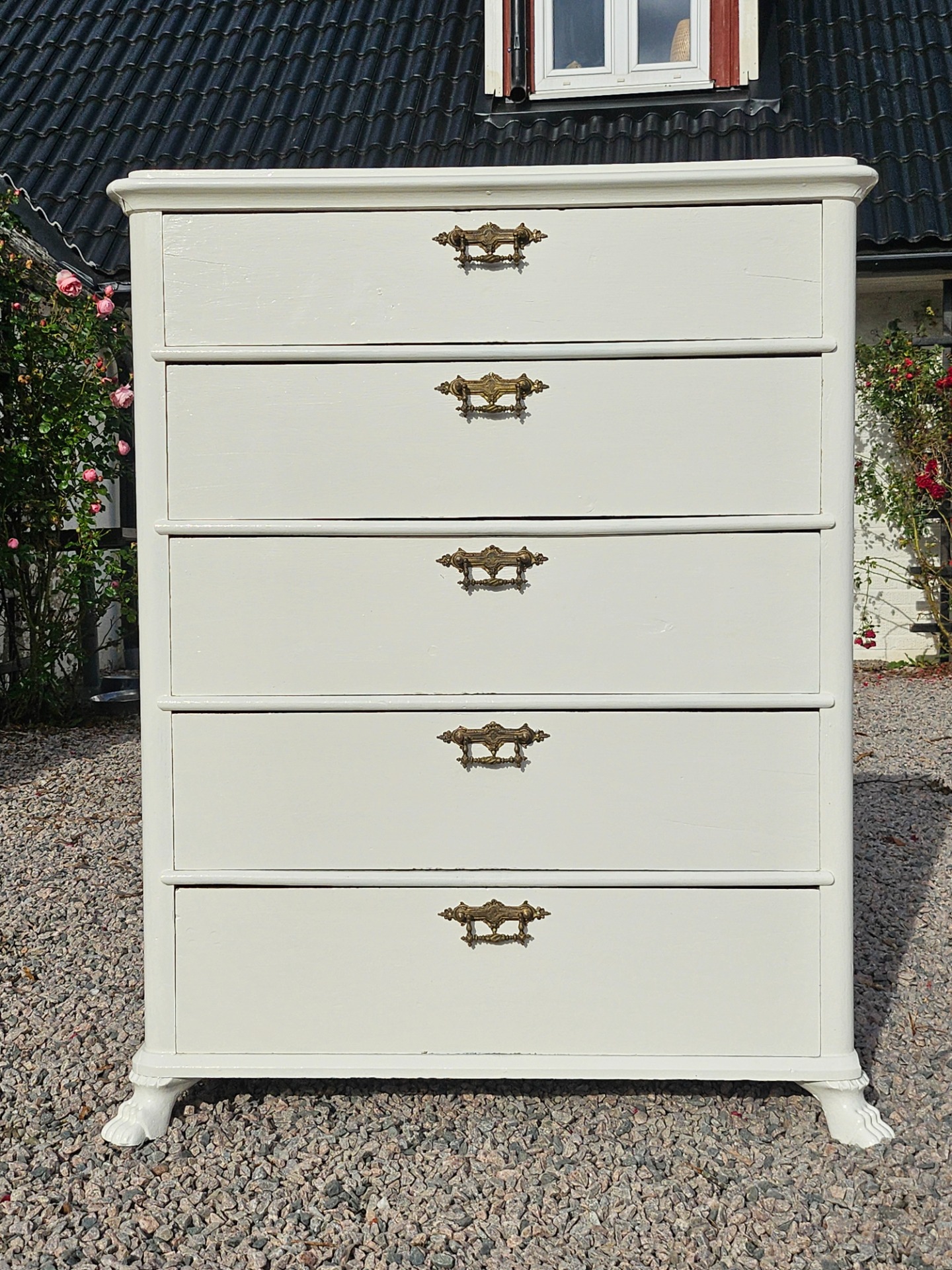Stor vacker 5-lådig byrå 1880-t handmålad med linoljefärg från Ottossons färgmakeri i kulören kittvit. Vackra antika mässingbeslag. Stora rejäla lådor som slukar mycket.