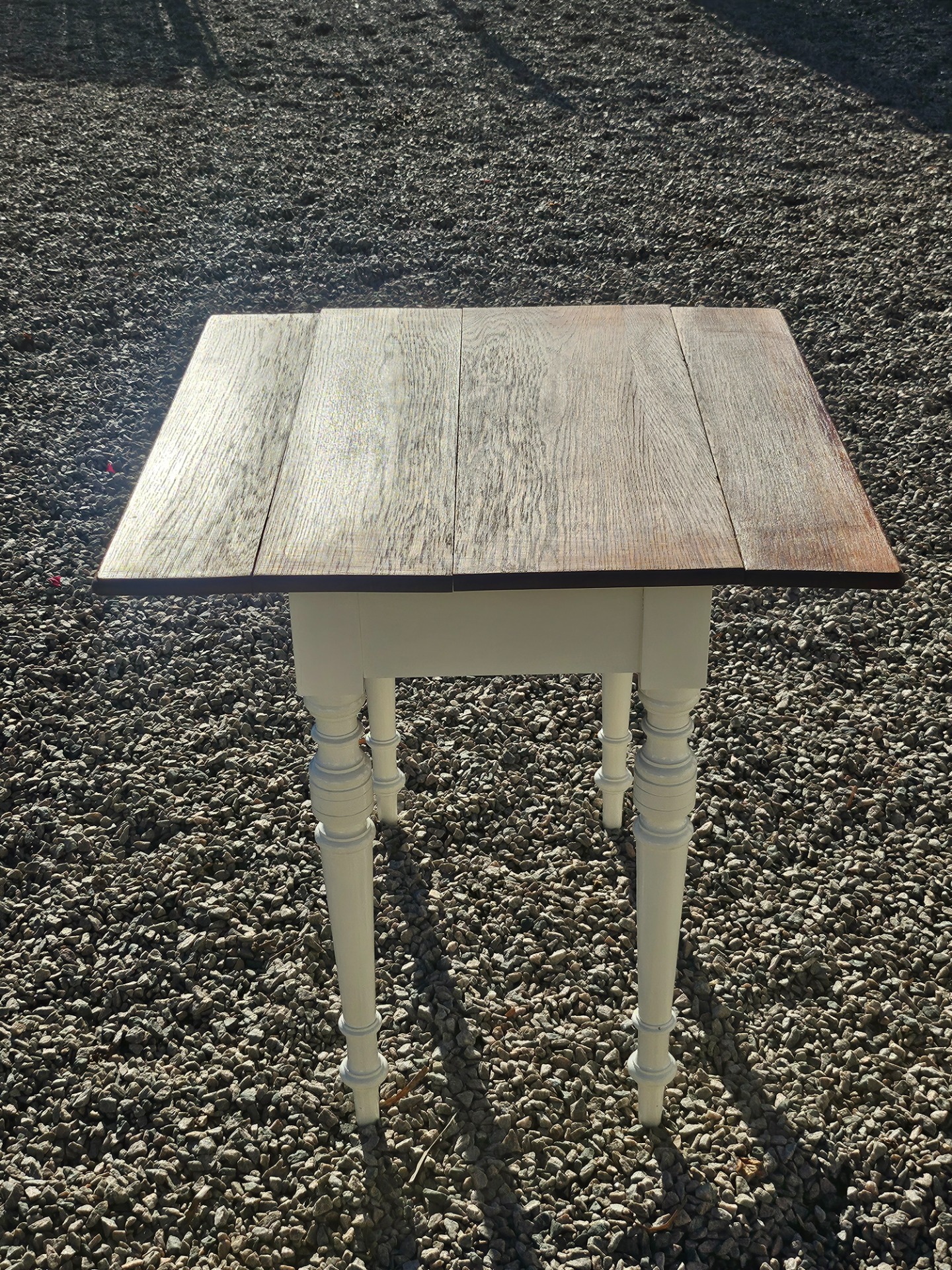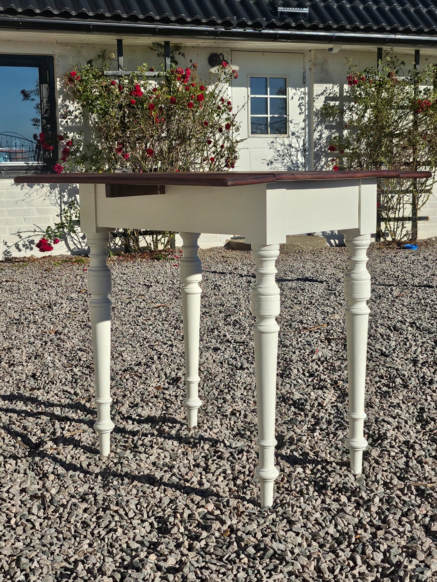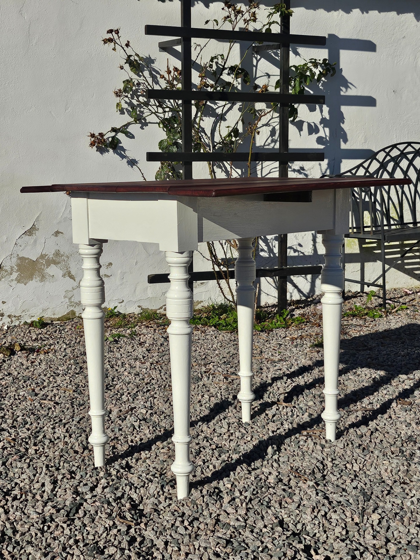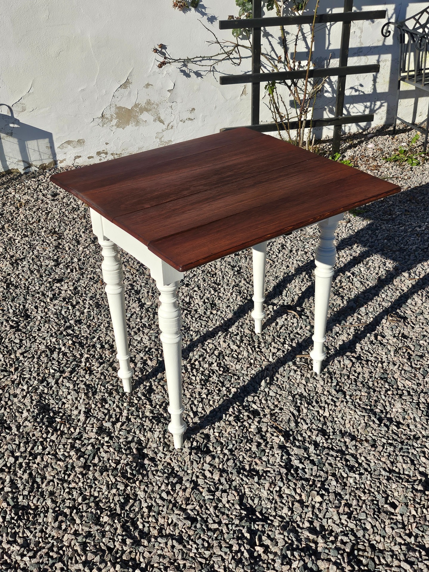 Mycket vackert klaffbord 1880-t. Skivan slipad och behandlad med linolja, nedre delen handmålad med linoljefärg från Ottossons färgmakeri i kulören kittvit.