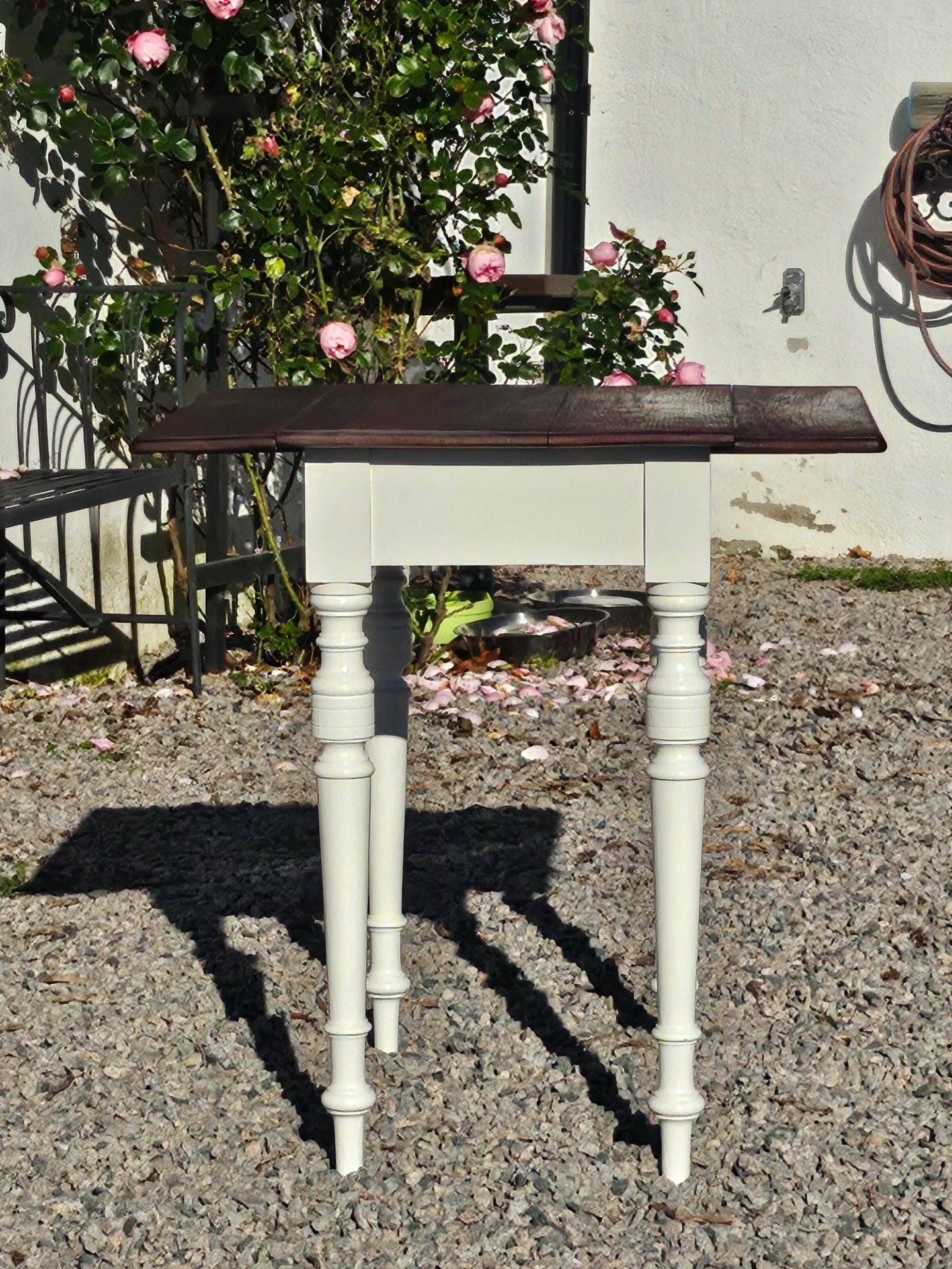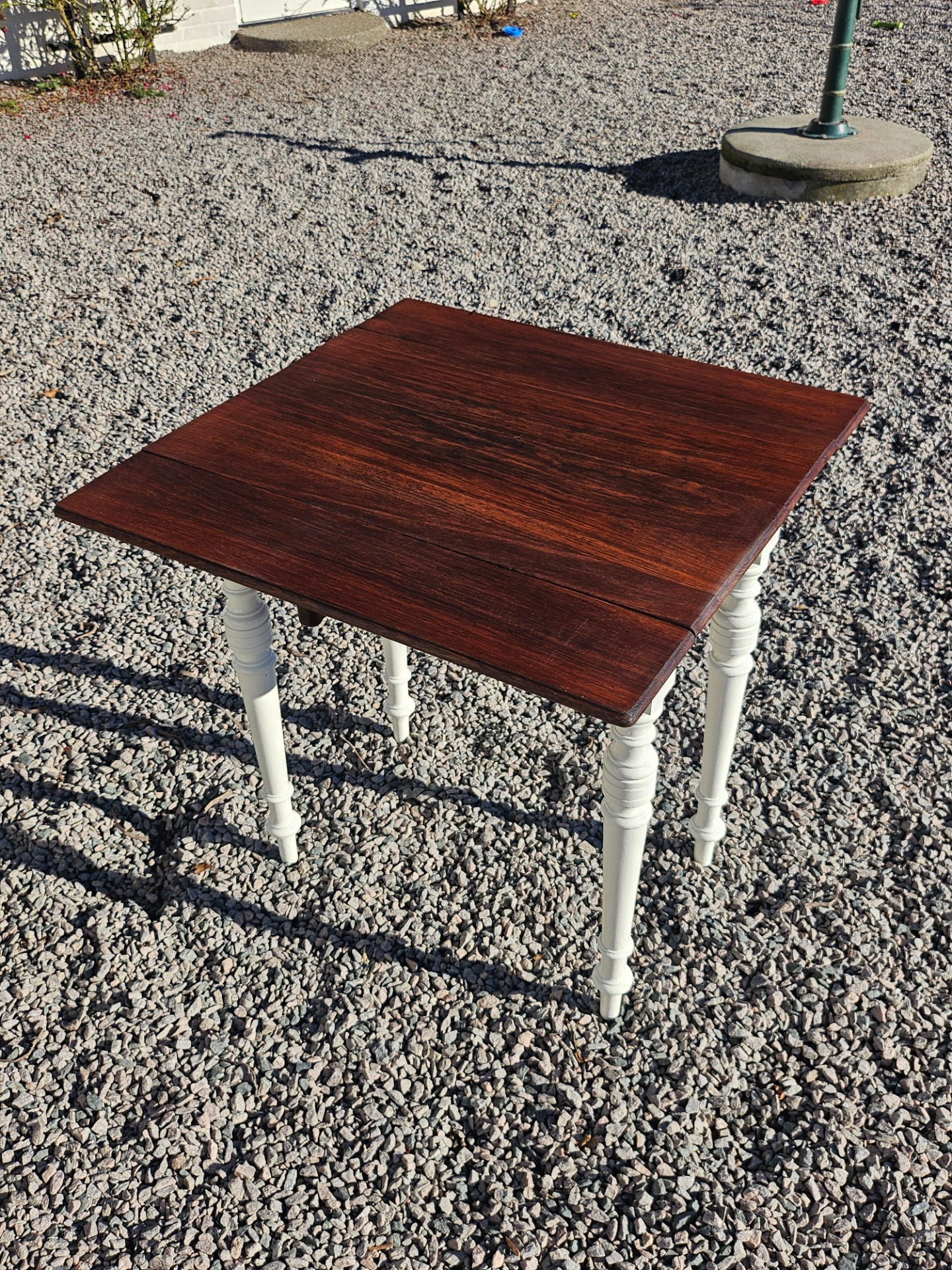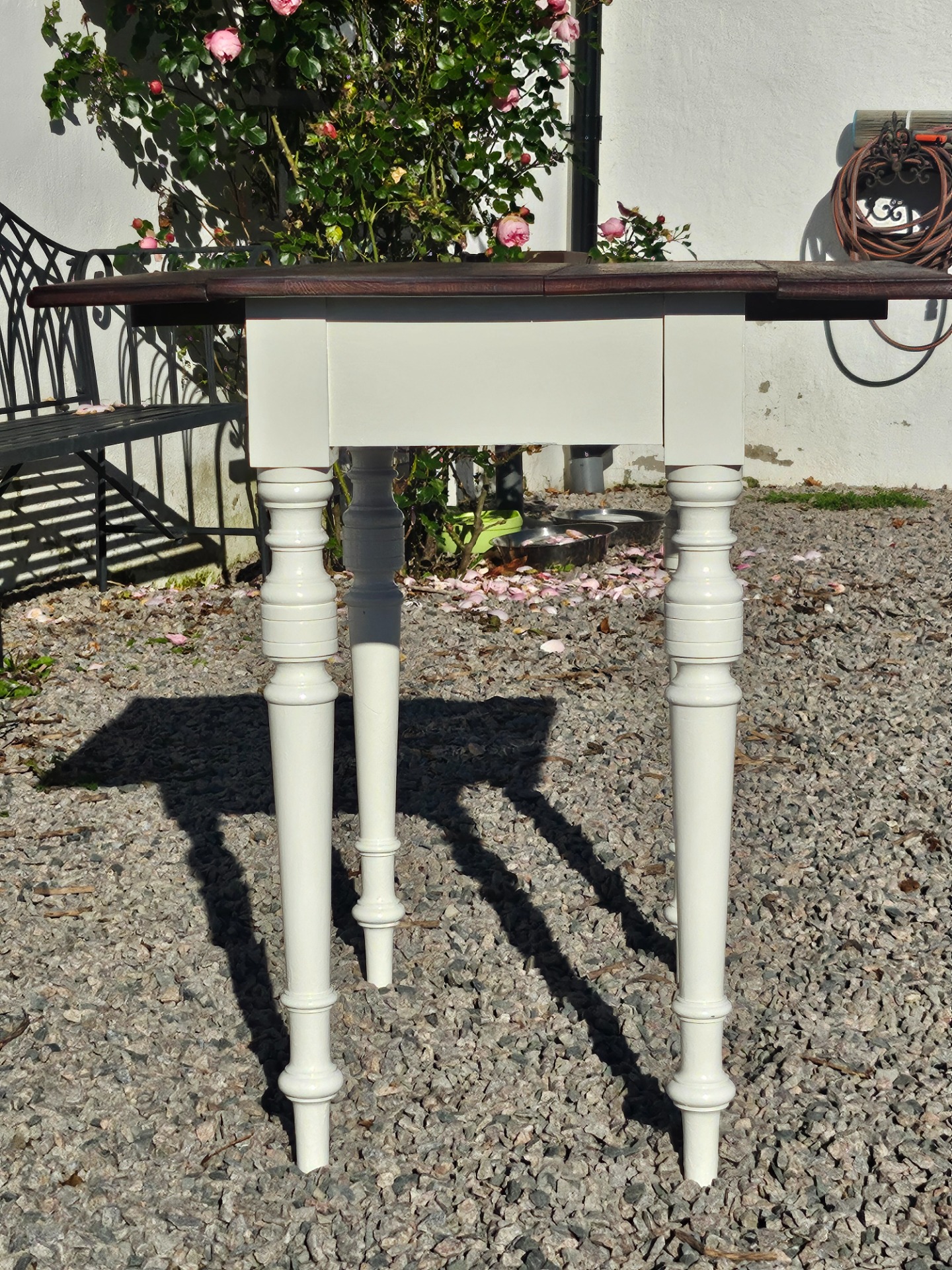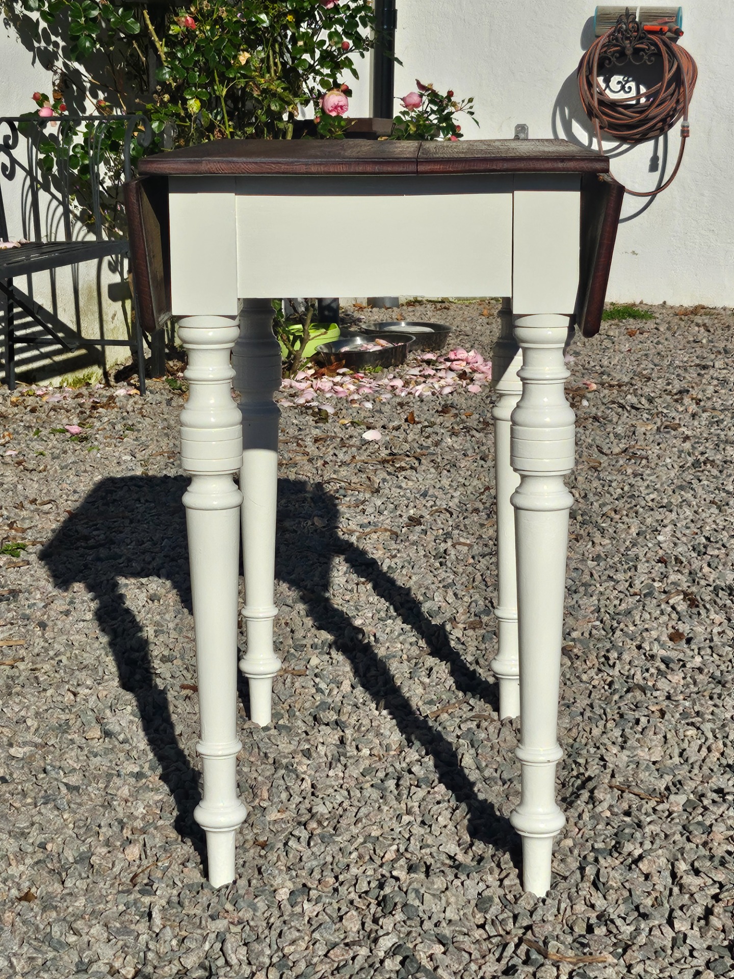 Mycket vackert klaffbord 1880-t. Skivan slipad och behandlad med linolja, nedre delen handmålad med linoljefärg från Ottossons färgmakeri i kulören kittvit.