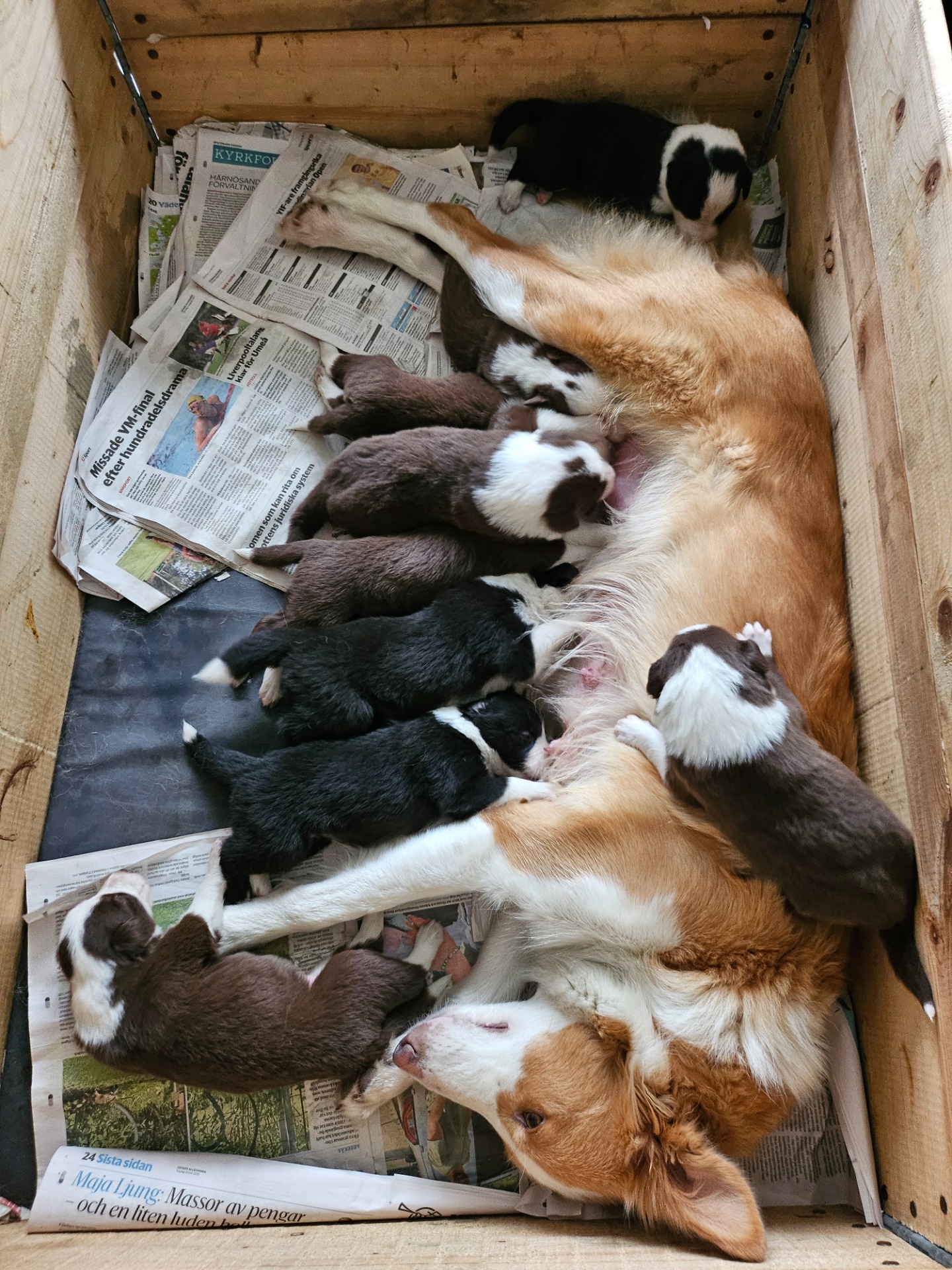 I juni 2021 köpte vi Border Collie hanen Texas, han är pappa till nio kullar. Berta har fått flera kulla hos oss och vi har sparat två tikar efter henne, Molly och Saga. Dessa tikar kommer också att vara gårdshundar och avelstikar hos oss. Vi har två tikar efter Molly och Texas, Blondie och Nala, båda har den ovanliga färgen golden(ee red)/vit. I maj-24 köpte vi hanen Junior Angel from Germany i Hamburg, han har Sportstamtavla och är avlad för sport i flera led. Han ska också deltaga i vår uppfödning.