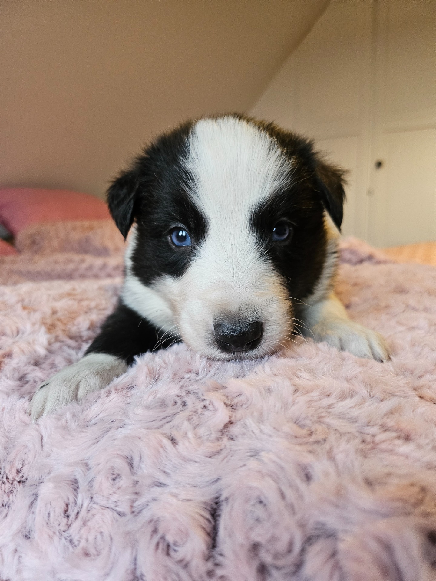 Vår Border Collie tik Berta är född på vår gård Ruckeltofta i Skåne. Hon är en blåögd skönhet som gärna leker med våra andra hundar, men det är hon som är boss på gården och de andra hundarna lyder henne jämt. Berta älskar hästar och följer gärna med ut på en ridtur. Hon är långhårig Border Collie och är svart/vit långhår med blå ögon. Berta ger valpar med blå och bruna ögon och pälsfärg dilution: blå och lila, trefärgade och svart/vit.