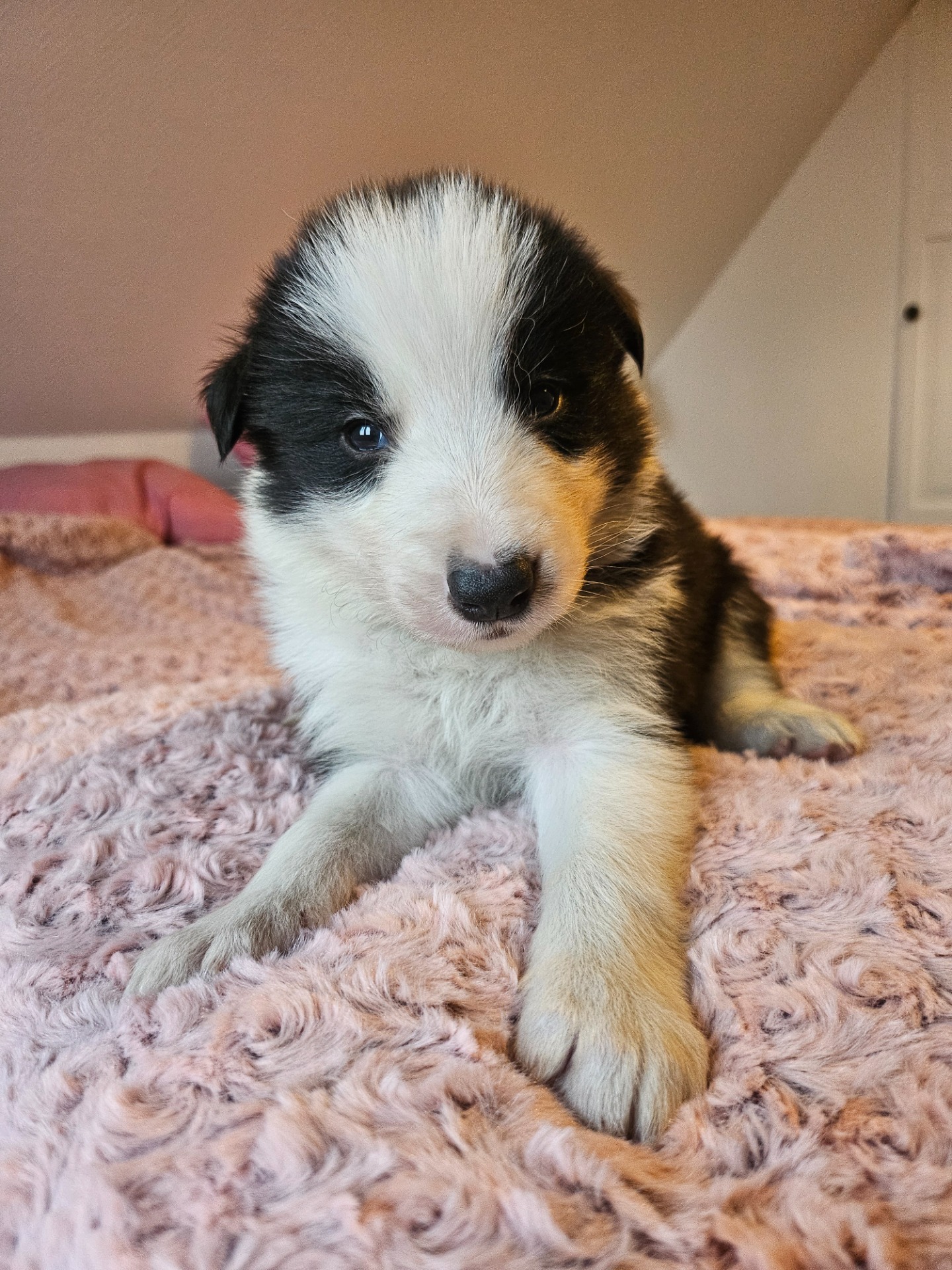 Molly är svart/vit långhår och ger valpar i färgen golden(ee red), svart/vit och trefärgad svart.