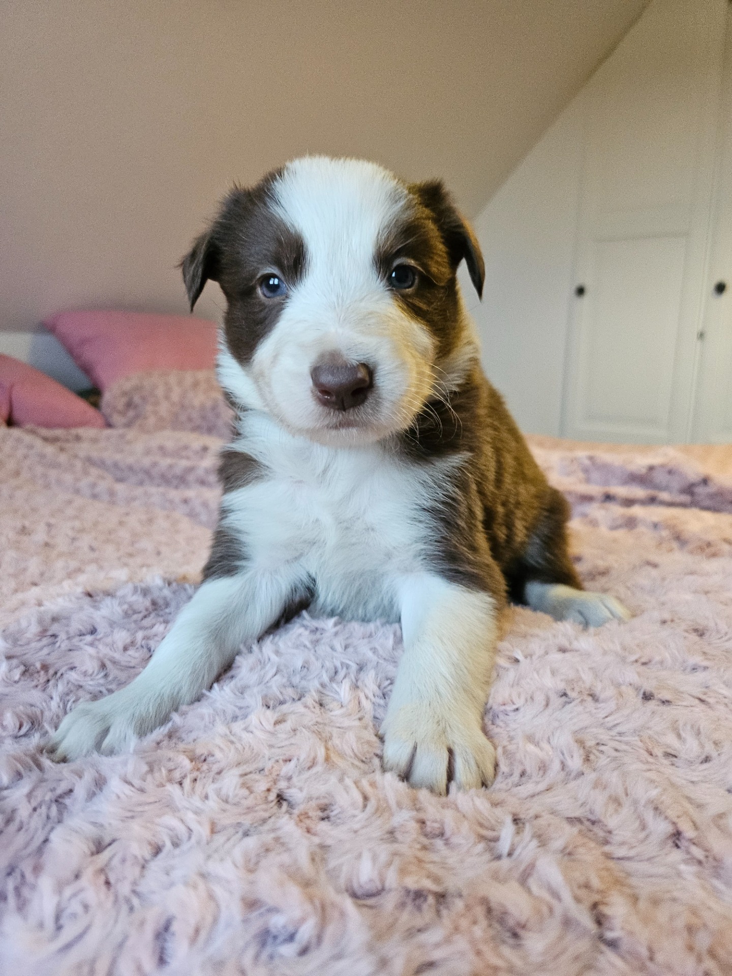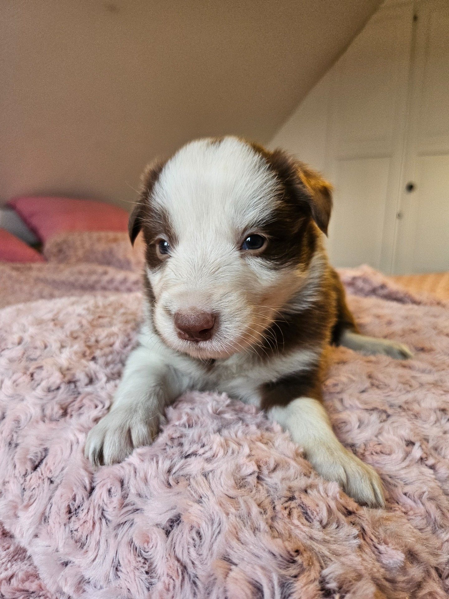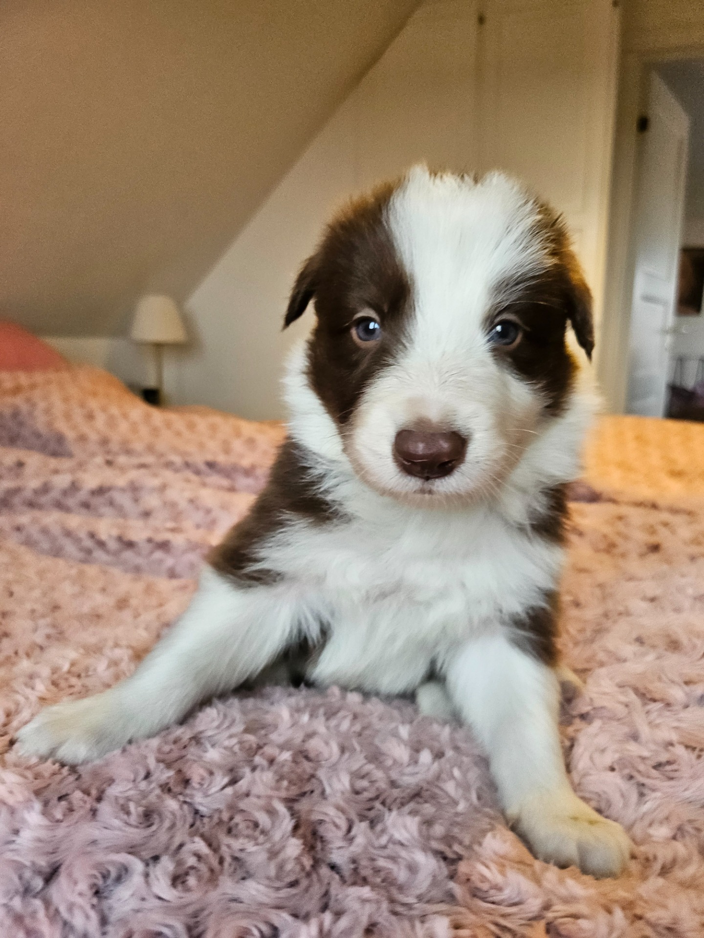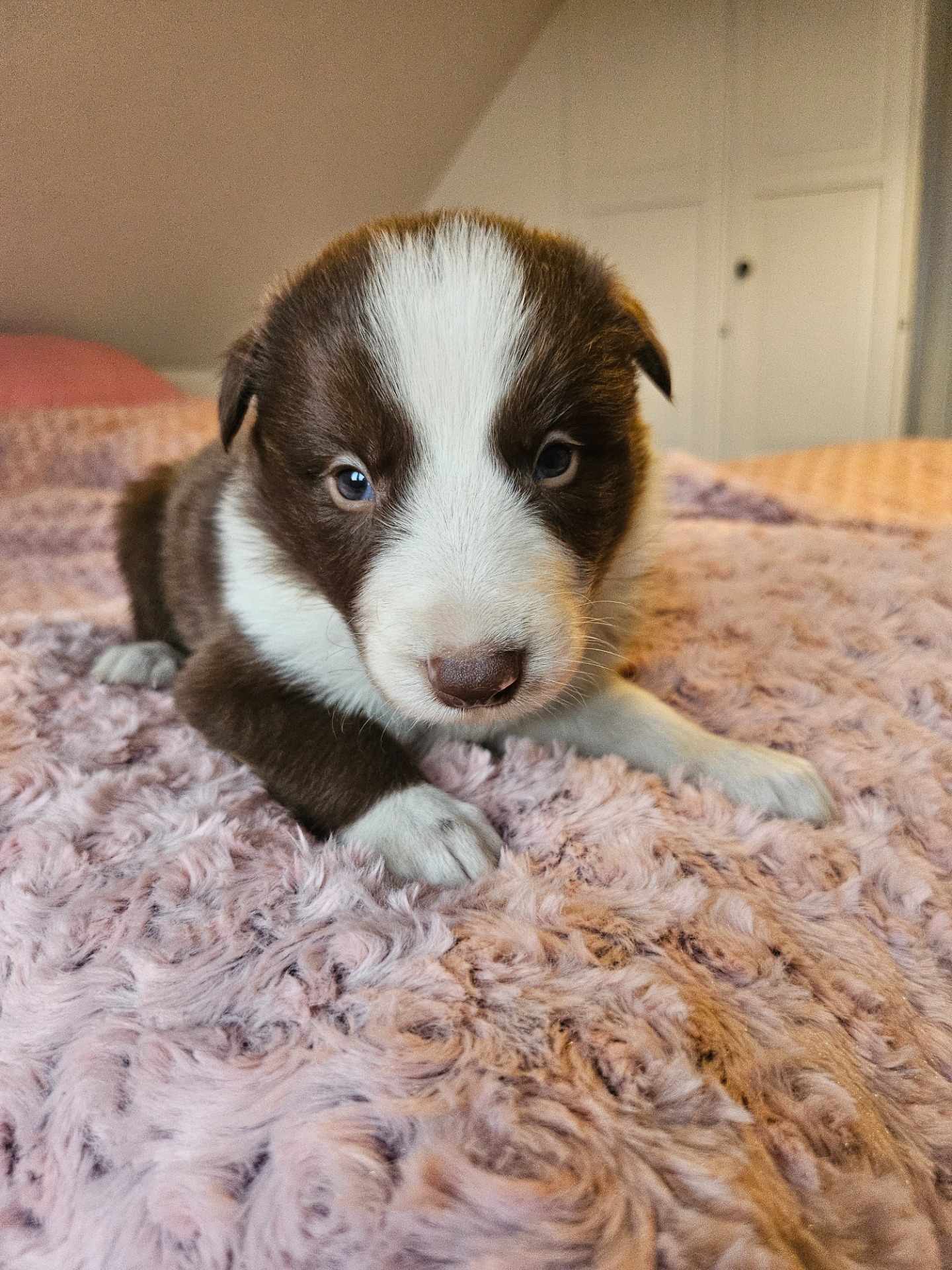 Junior är en choklad/vit långhårig Border Collie hane importerad från Tyskland-24 med stamtavla. Hans föräldrar är från Sportlinjer, han är vår familjehund och avelshane. Junior är mycket snäll och lättlärd, busar helst med Saga och Blondie hela dagarna. Vi kommer träna lydnad och agility med honom. Junior bär på choklad, svart/vit och trefärgat anlag. Junior är pappa till en kull.