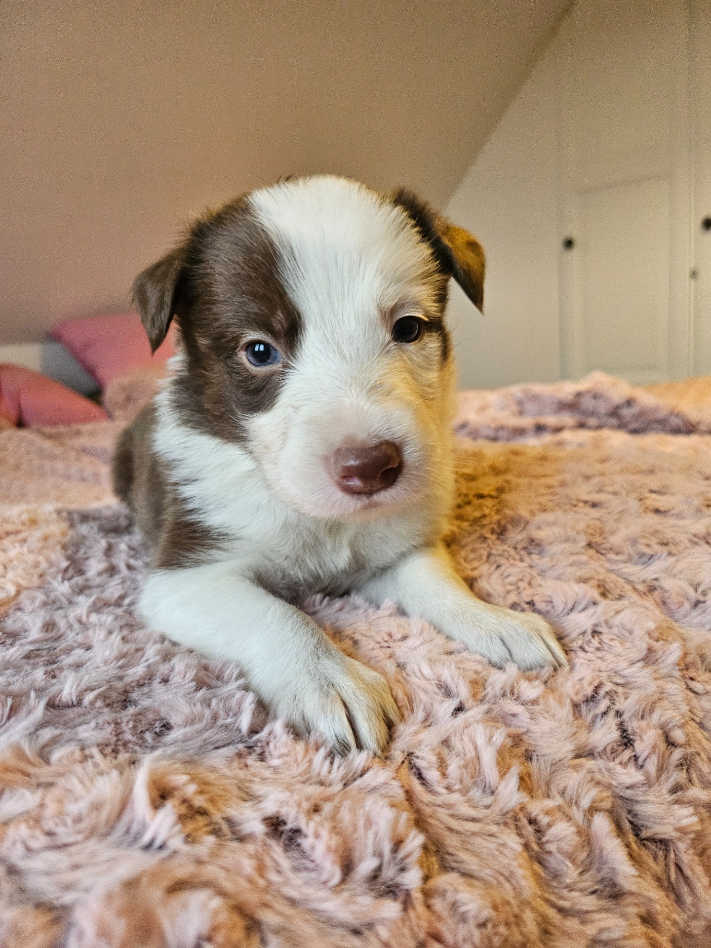 Blondie är dotter till Molly och hon har den ovanliga färgen golden(ee red)/vit och är långhårig. Hon är en mycket glad och är en trevlig hund. Blondie leker mest med storasyster Saga, lillasyster Nala och vår hane Junior hela dagarna. Vi kommer att träna henne i lydnad och agility. Blondie bär på anlaget eered(golden), choklad, dilution, svart/vit och trefärgad.